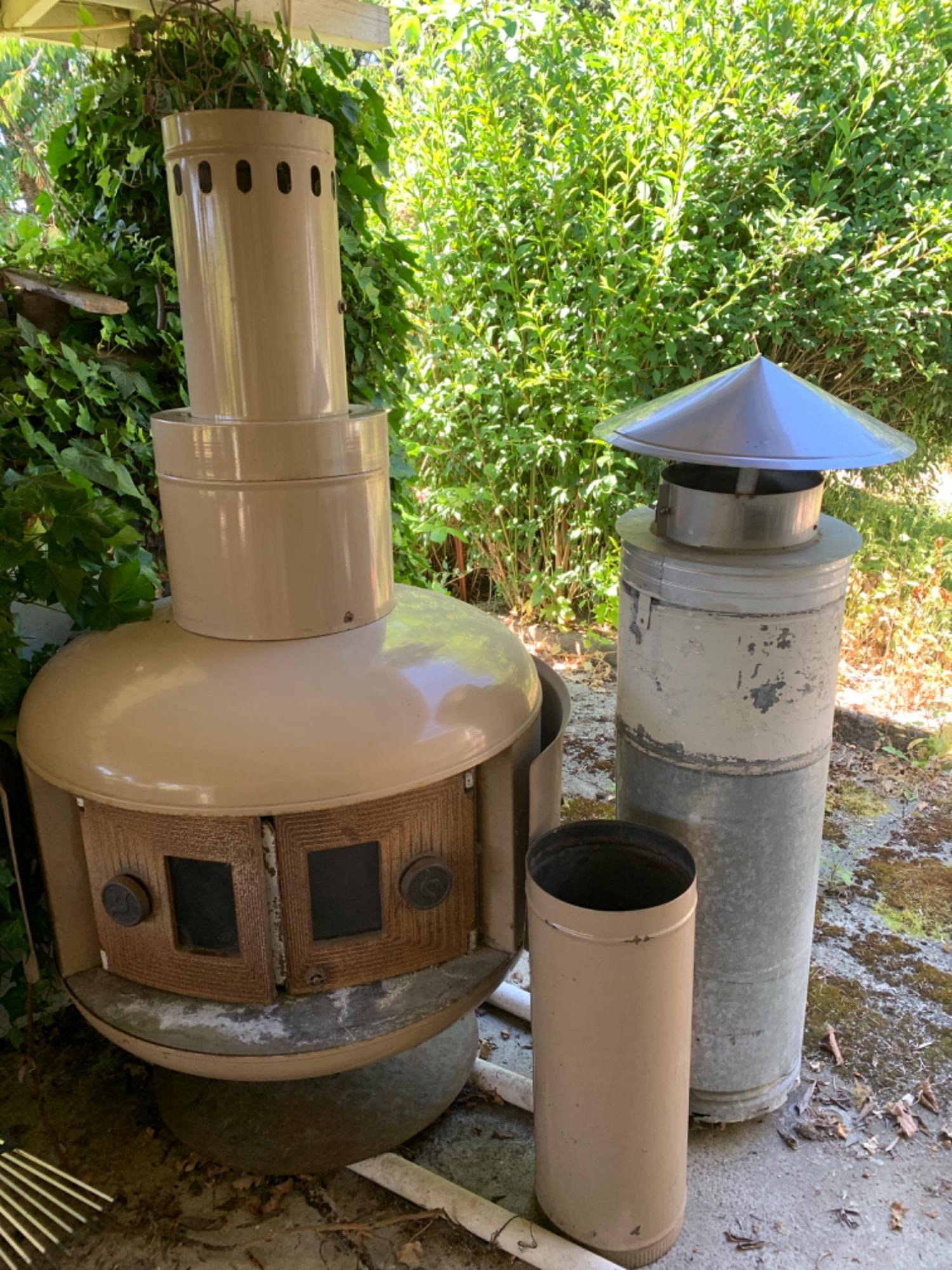 Large Malm Scandinavian style wood stove. Includes two matching stove pipes. One larger stove pipe with vent. Has some rust and oxidation. Body is in good condition. Will need cleaned. Very heavy bring help to load. Top stove pipe slides out for loading. Outer metal band for heat barrier and distribution.