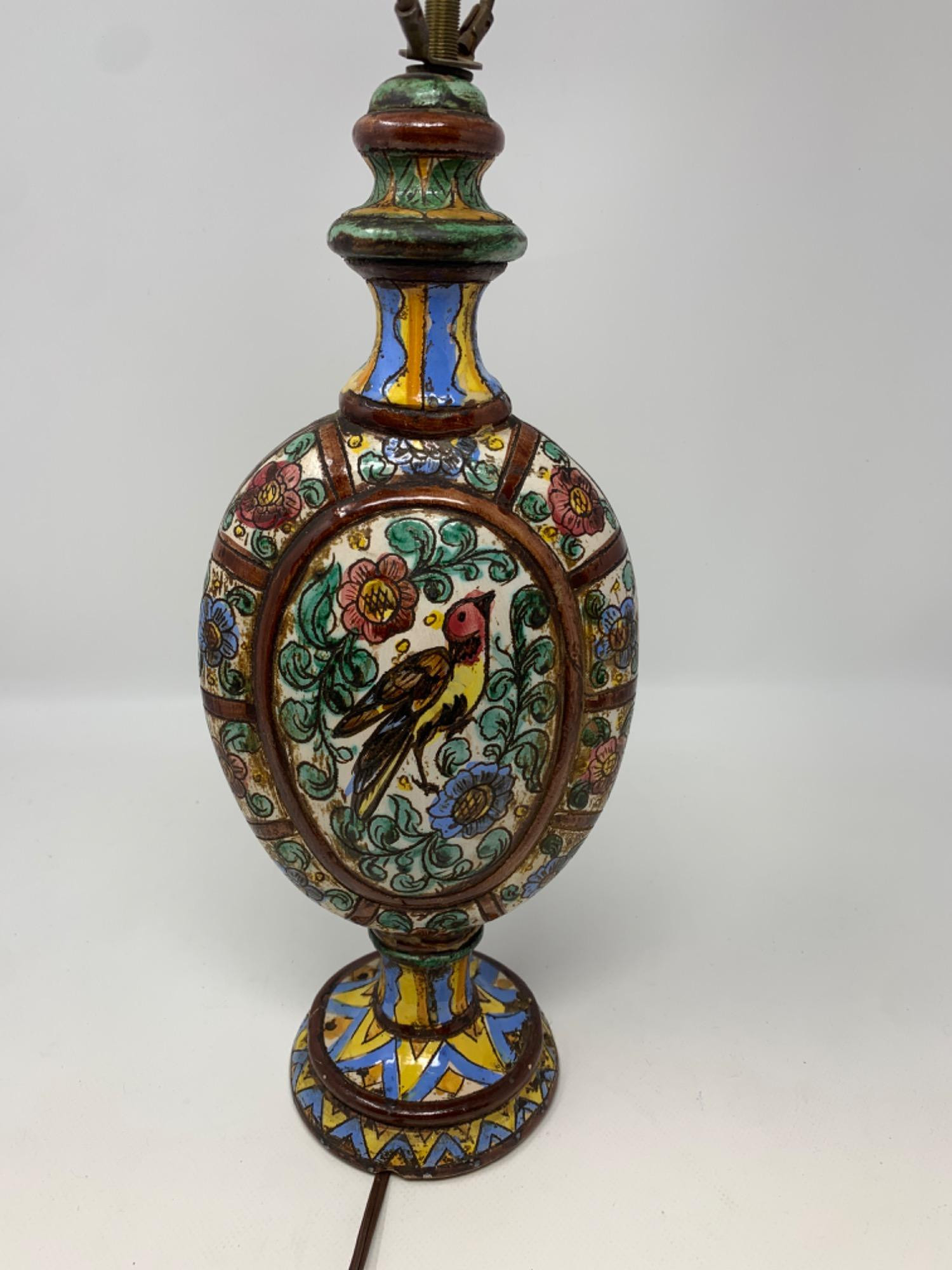 Vintage Sgraffito bird, Italian glazed lamp. Needs a gentle cleaning. 15in tall (base only) 6in wide. Rod is adjustable height. Did not test, no bulb.