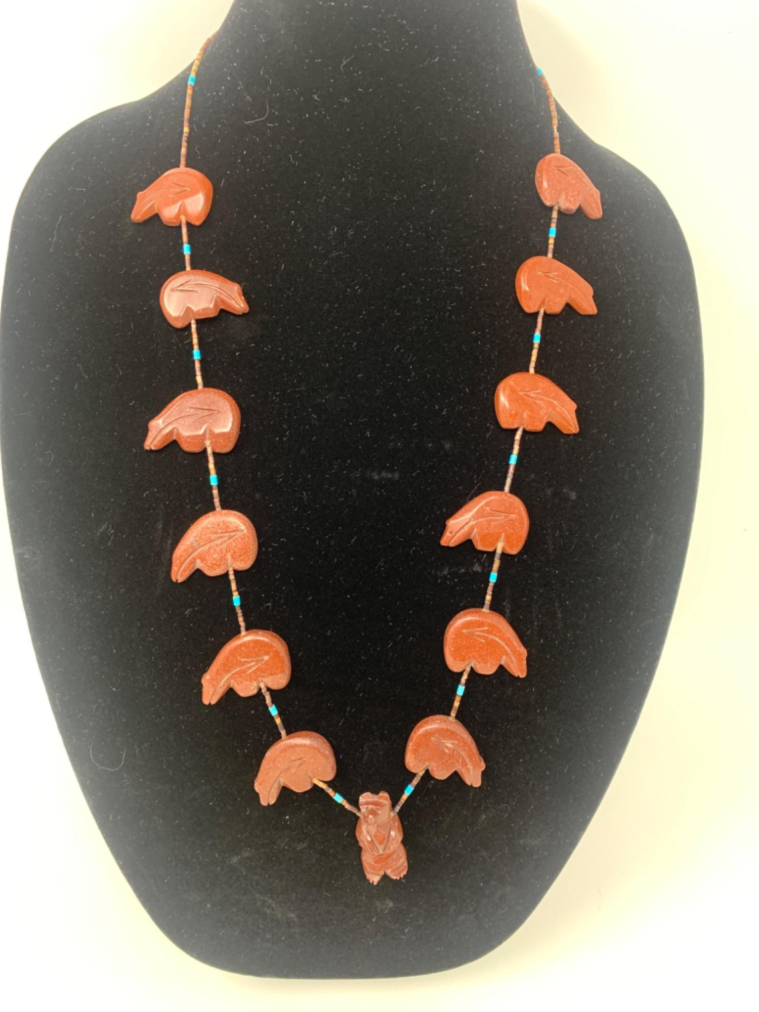 Hand carved stone fetish necklace is 14 inches long when clasped. Larger bear pendant with great detail. Turquoise and quill beads. Silver clasp. Reddish brown color.