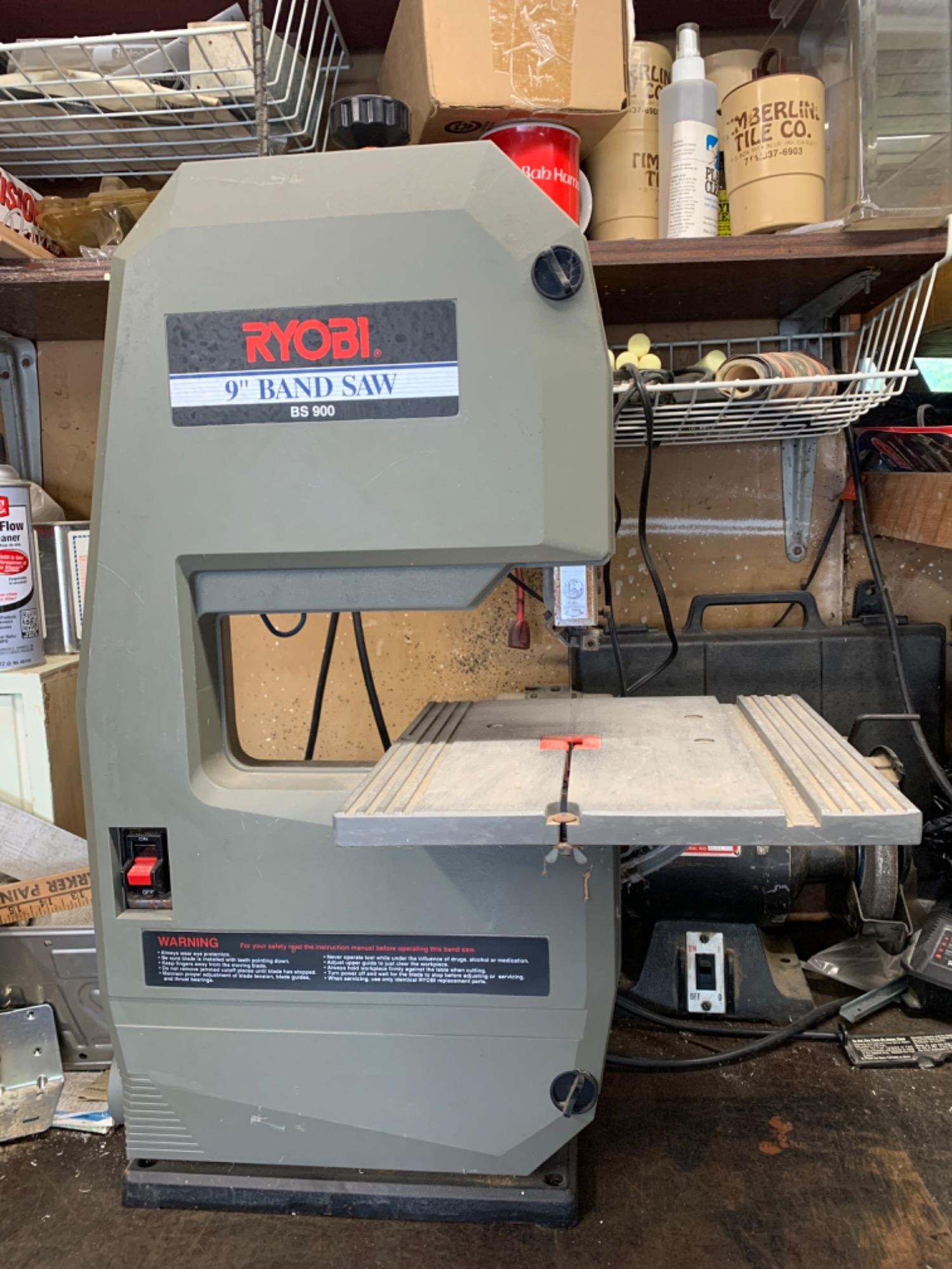 Ryobi BS 900 electric 9"inch band saw. Powered up. Dimensions are 28in tall, 19in long, 12in wide. Counter size and easily portable.