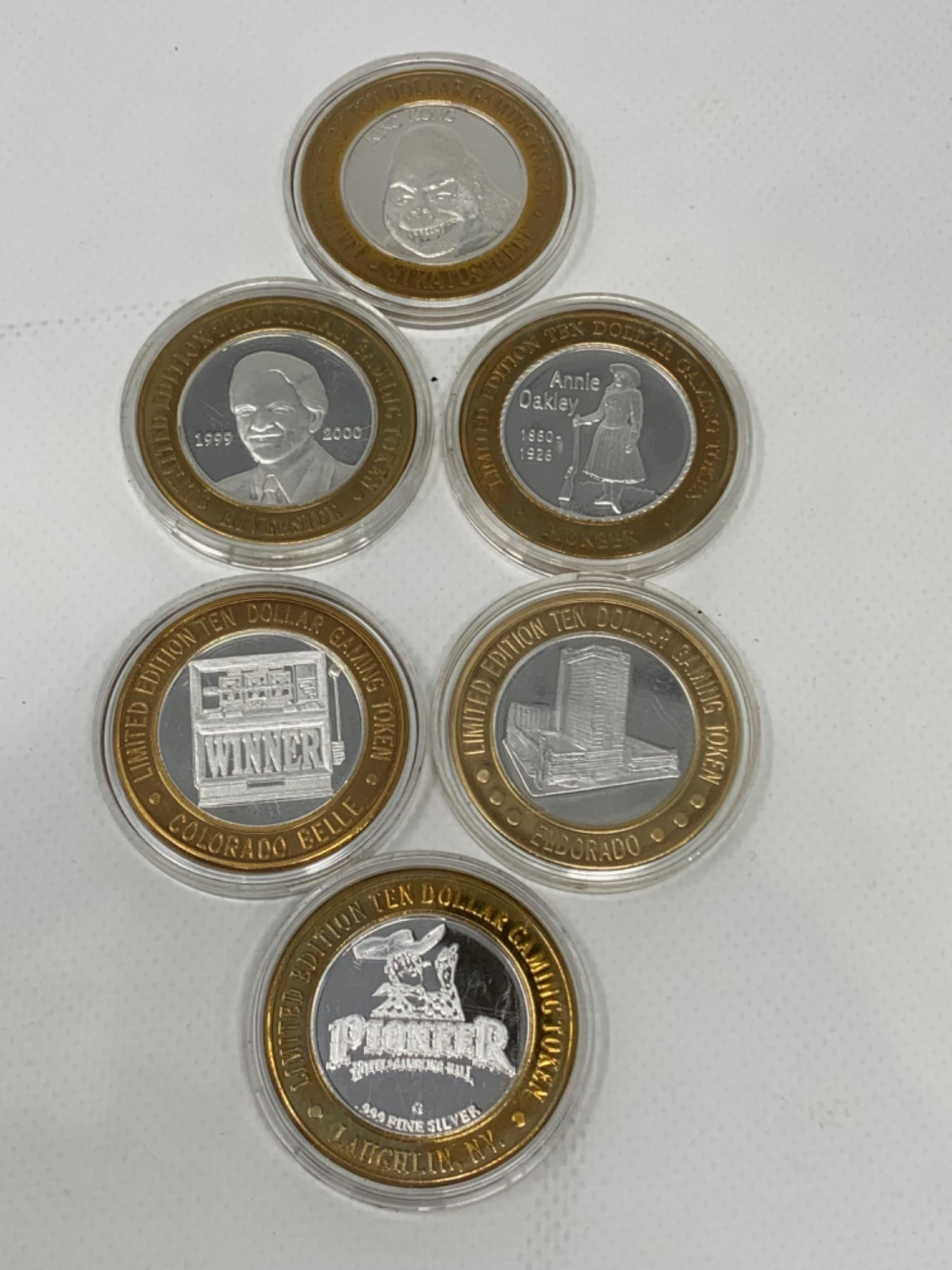 Lot # 22 - Six .999 Fine Silver Gaming Tokens-223 Grams Total-All $10 Coins