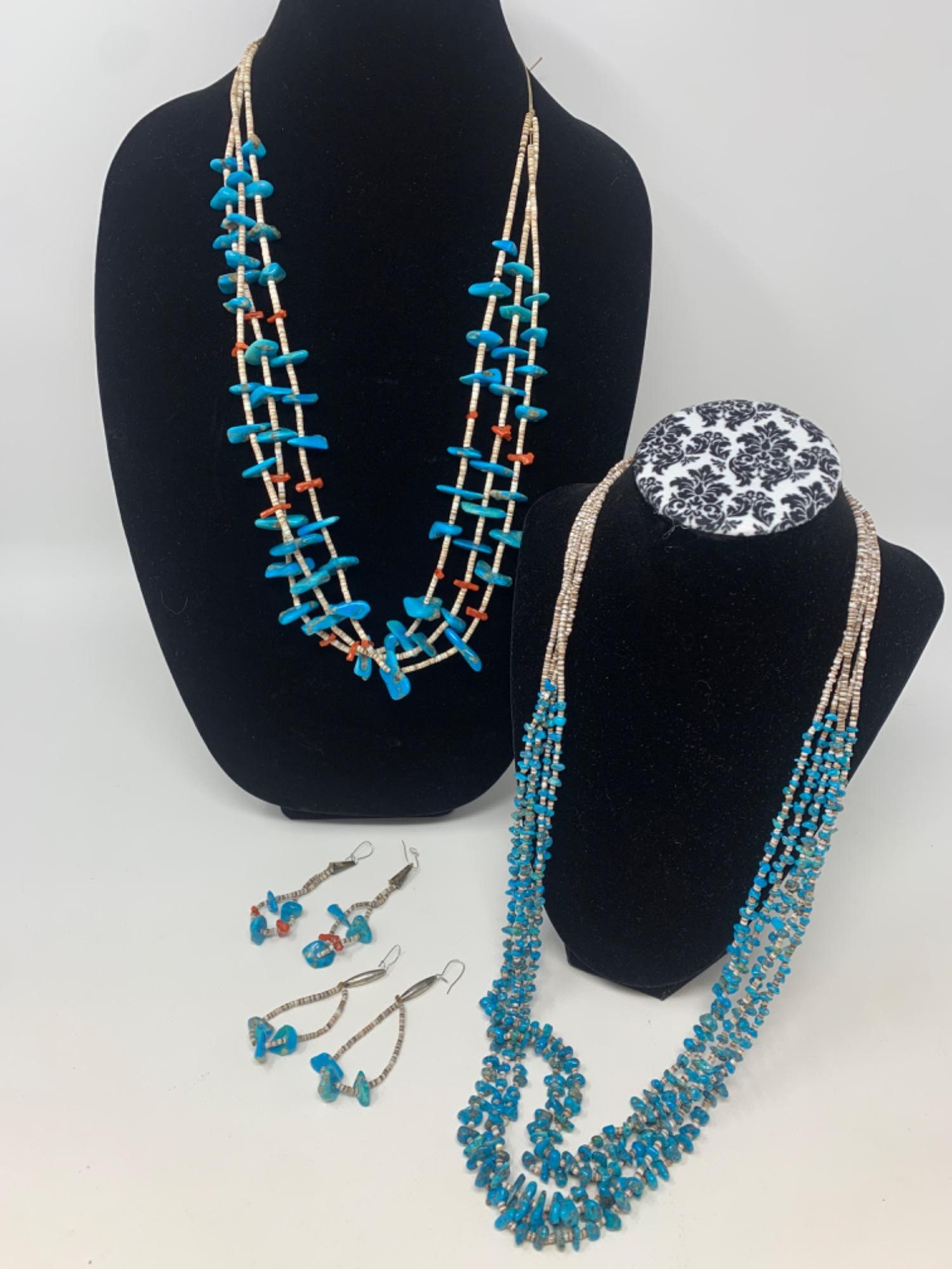 Two necklaces with matching earrings. Turquoise stones, and shell beads. Three strand necklace is 15 inches long when clasped. Five strand necklace is 14in long when clasped. Sterling silver clasp. Beautiful quality set.