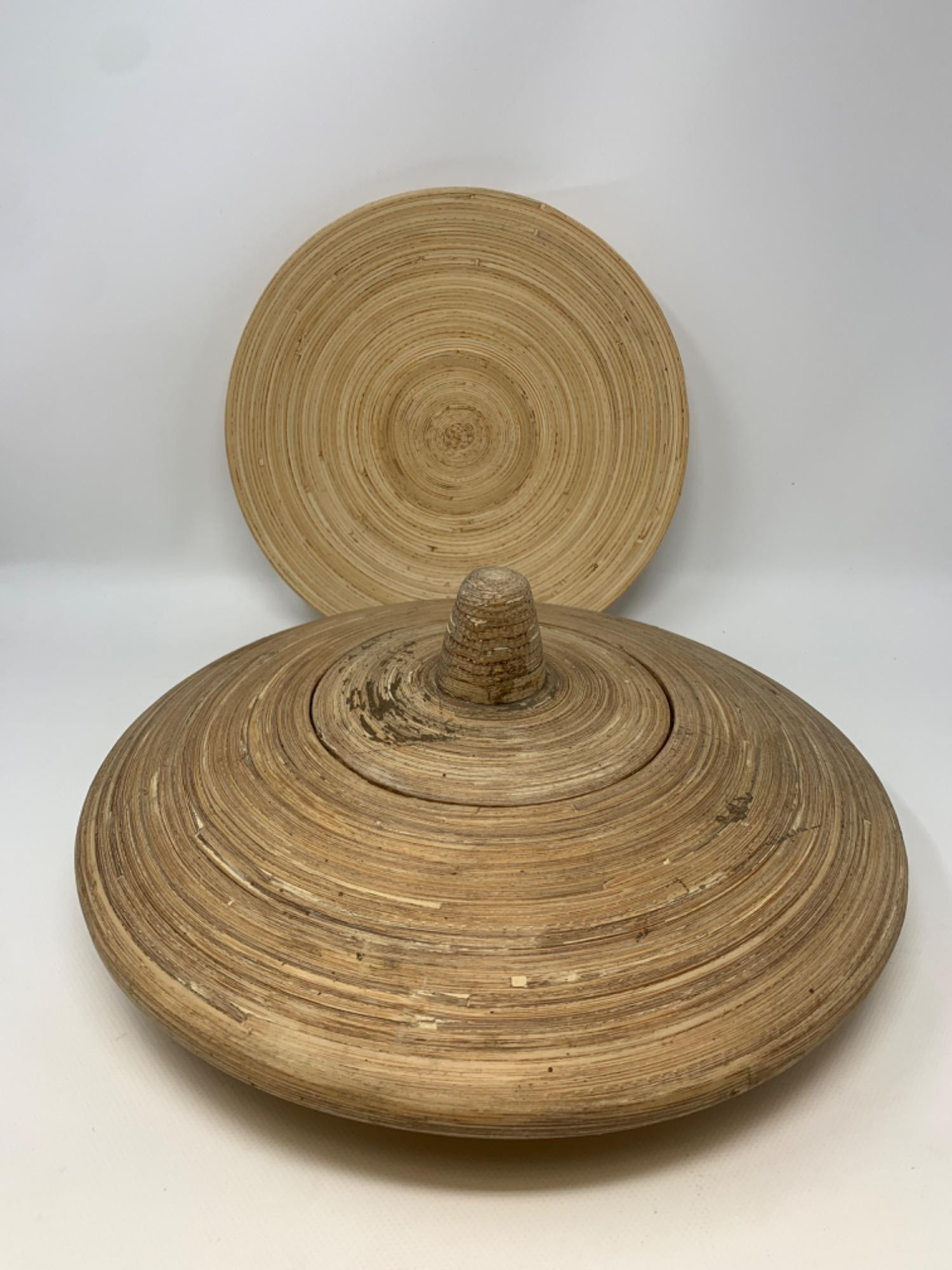 Large, lidded UFO bowl Dimensions are 15.5 inches in diameter, 6.5 inches tall. Smaller woven wood tray.