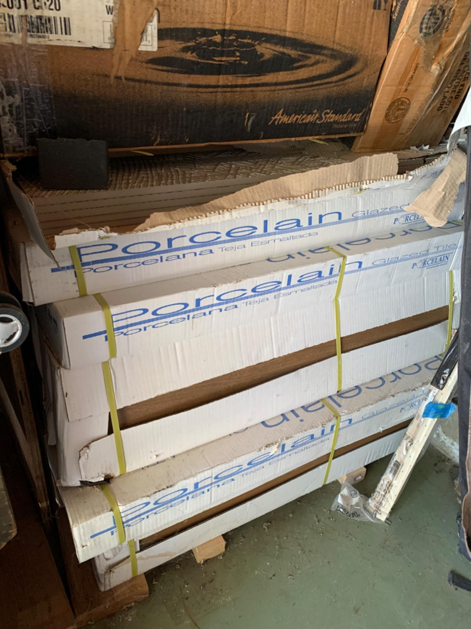 Approximately 400-450sq feet. Approximately 20 boxes. Stacked. Dimensions are 8x35.5 Porcelain wood textured floor tile. Cherry color NIB-purchased by tile installer One piece is broken.