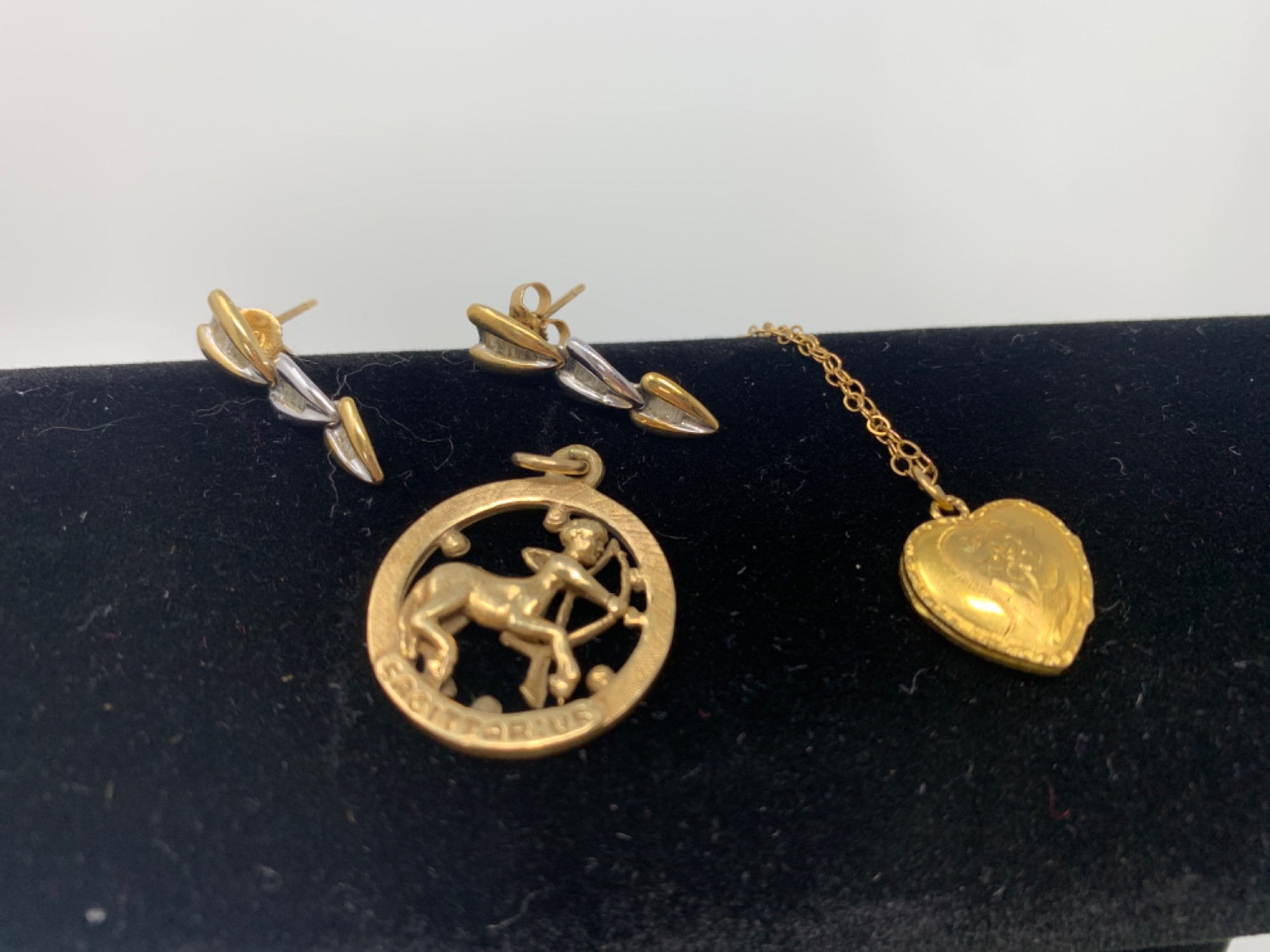 10k gold and diamond like earrings. 14k gold Sagittarius pendant. 10k gold heart locket necklace.