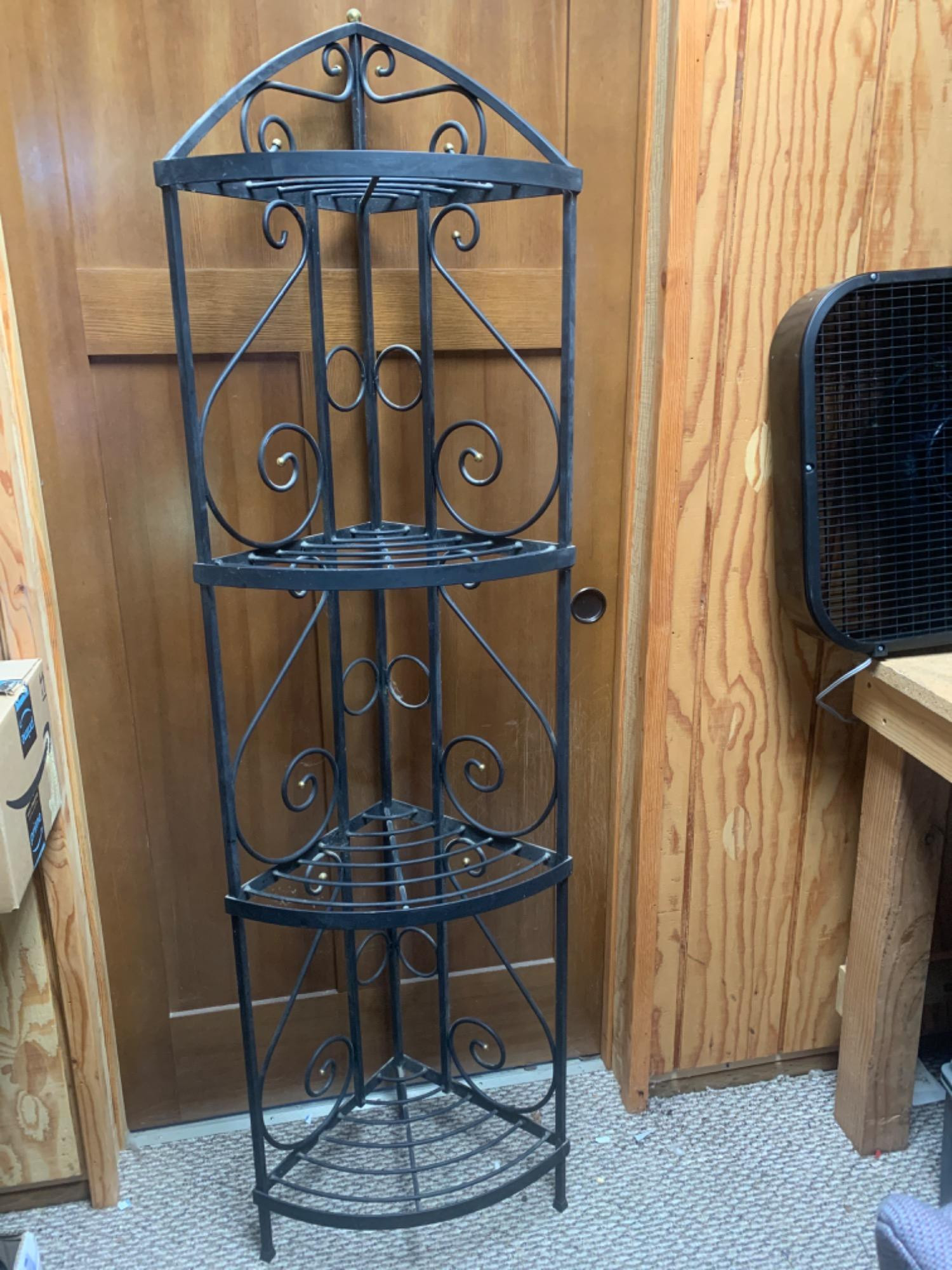 Dimensions are 14 inches wide, 19 inches long, 68.5 inches tall. Wrought iron with brass accents. Four shelves.