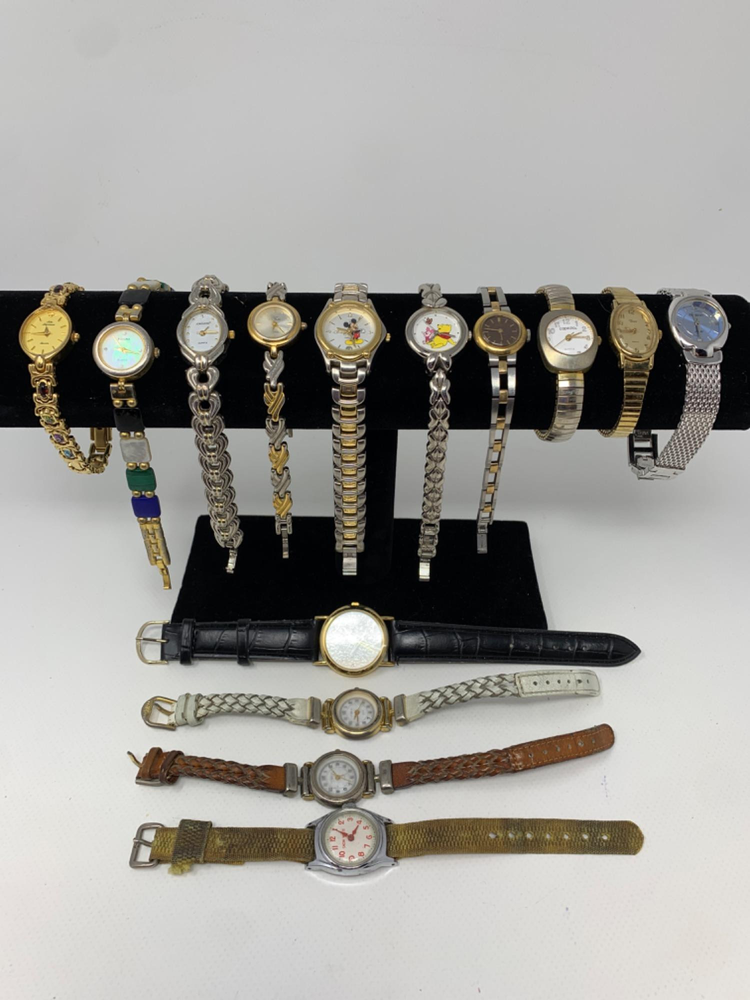 14 watches! Le Jardine, Jordache, Disney, Timex and quartz. Gold, Silver and leather bands. Some work and some need serviced. wonderful mix for any outfit.