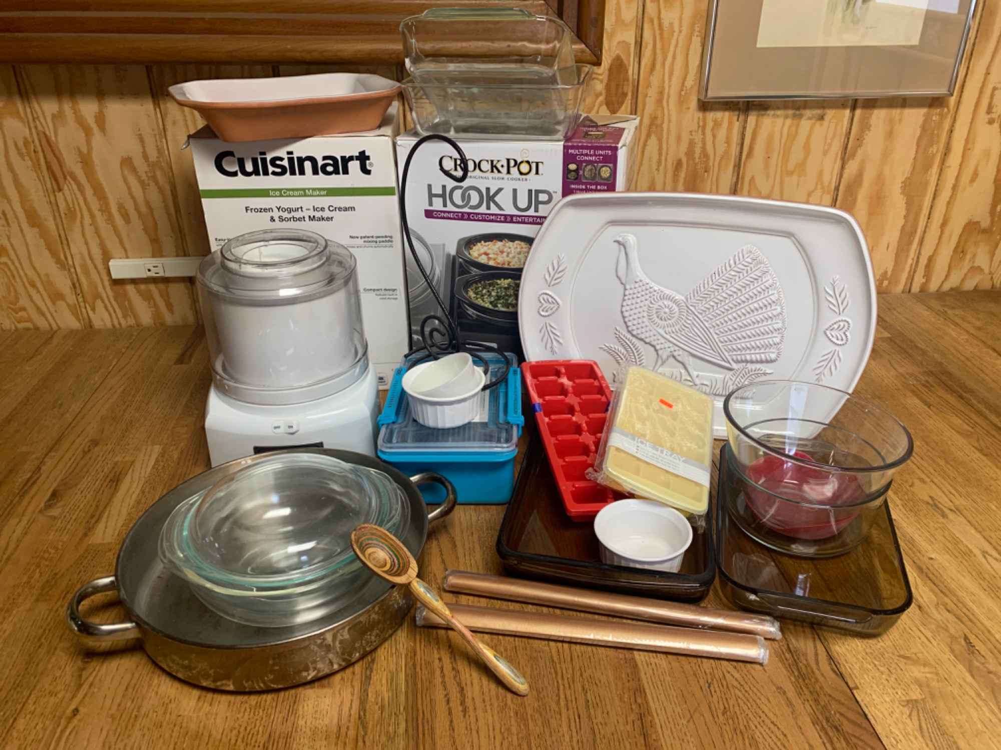 Assorted kitchen essentials. Cuisinart ice cream maker, crockpot hookup, pans, platters and more. See pics.