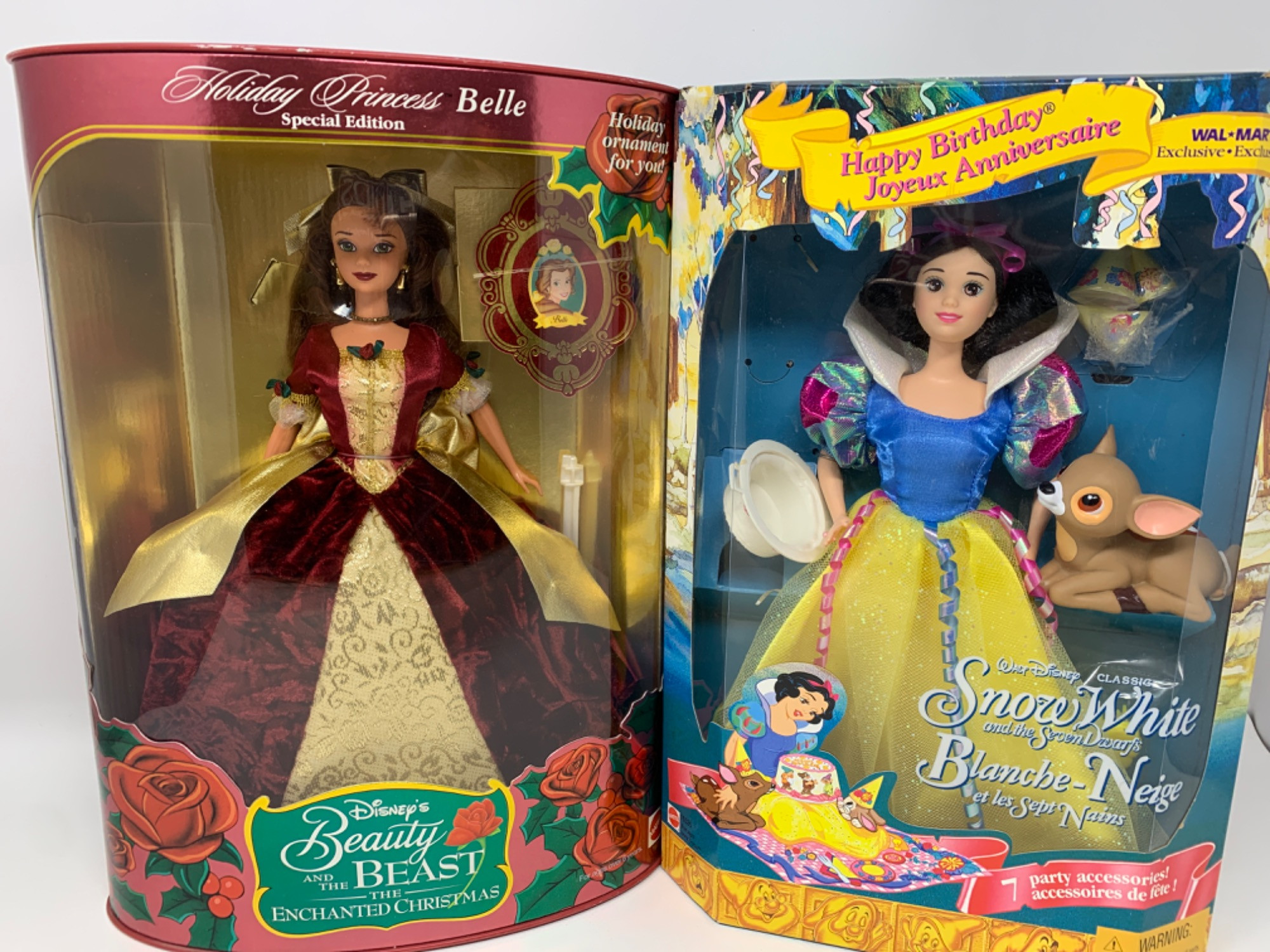 Beauty and the beast the enchanted Christmas Barbie. Holiday princess special edition. Includes holiday ornament. Disney Snow White and the seven dwarfs Barbie. Exclusive Happy Birthday Spanish version. Includes seven party accessories. NIB.