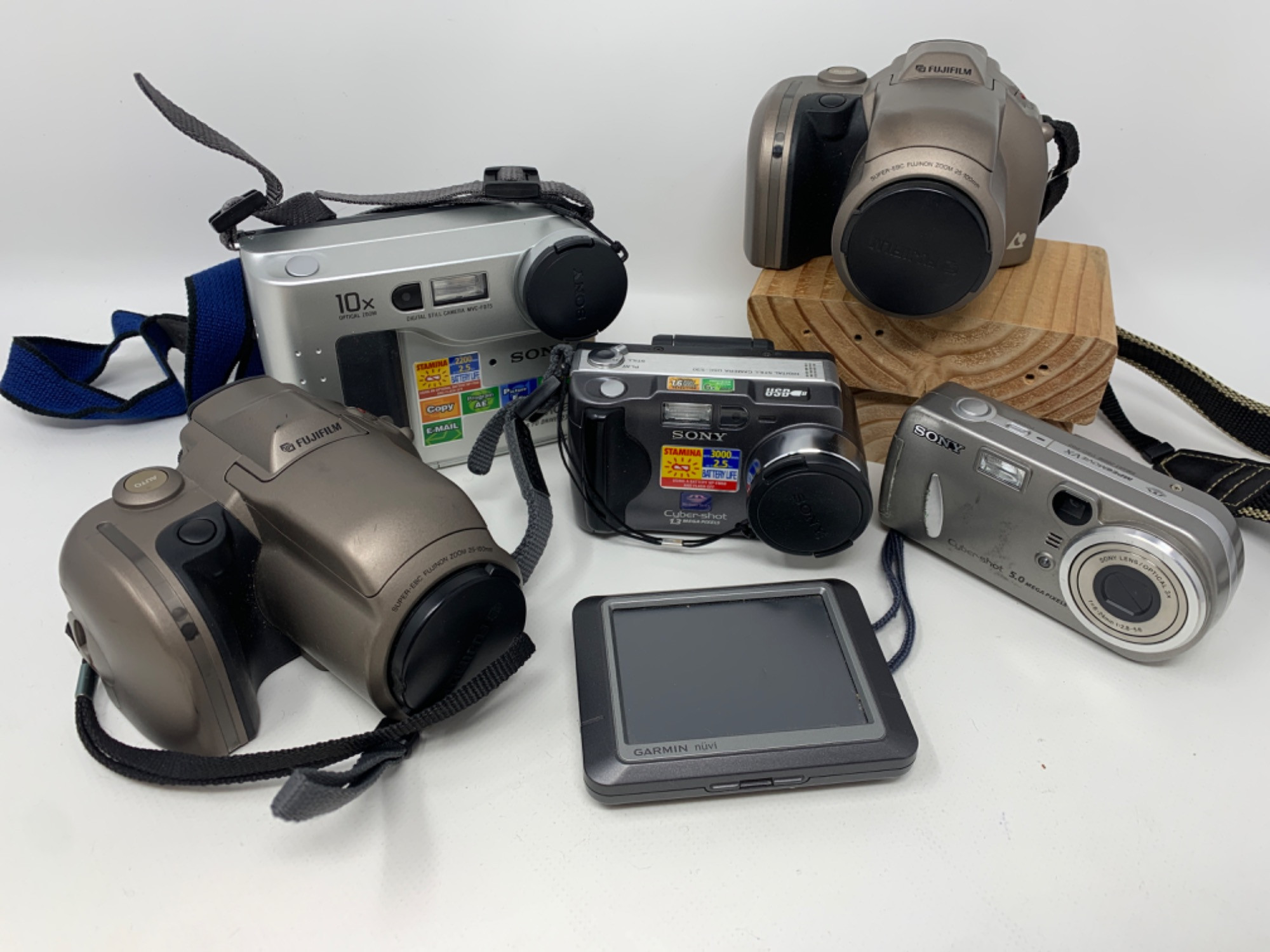 Sony FD Mavica, digital camera. Sony cyber shot digital camera. X2. Two Fujifilm digital cameras. Garmin Nuvi. All need batteries or charged. several have camera bags.