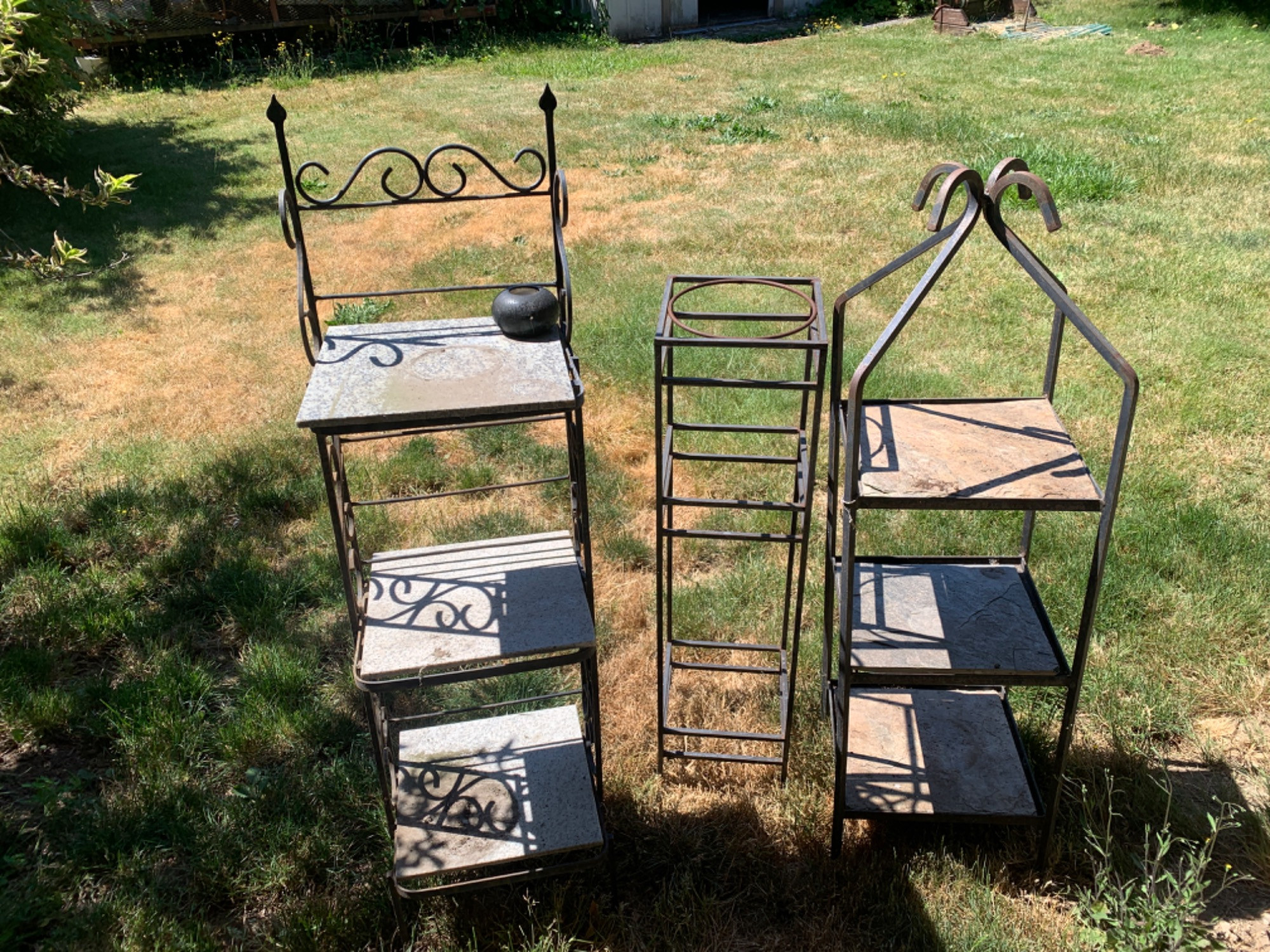 3 heavy duty metal plant stands. Removable tile shelves. Some rust. Heavy. Various dimensions and styles. One without inserts.