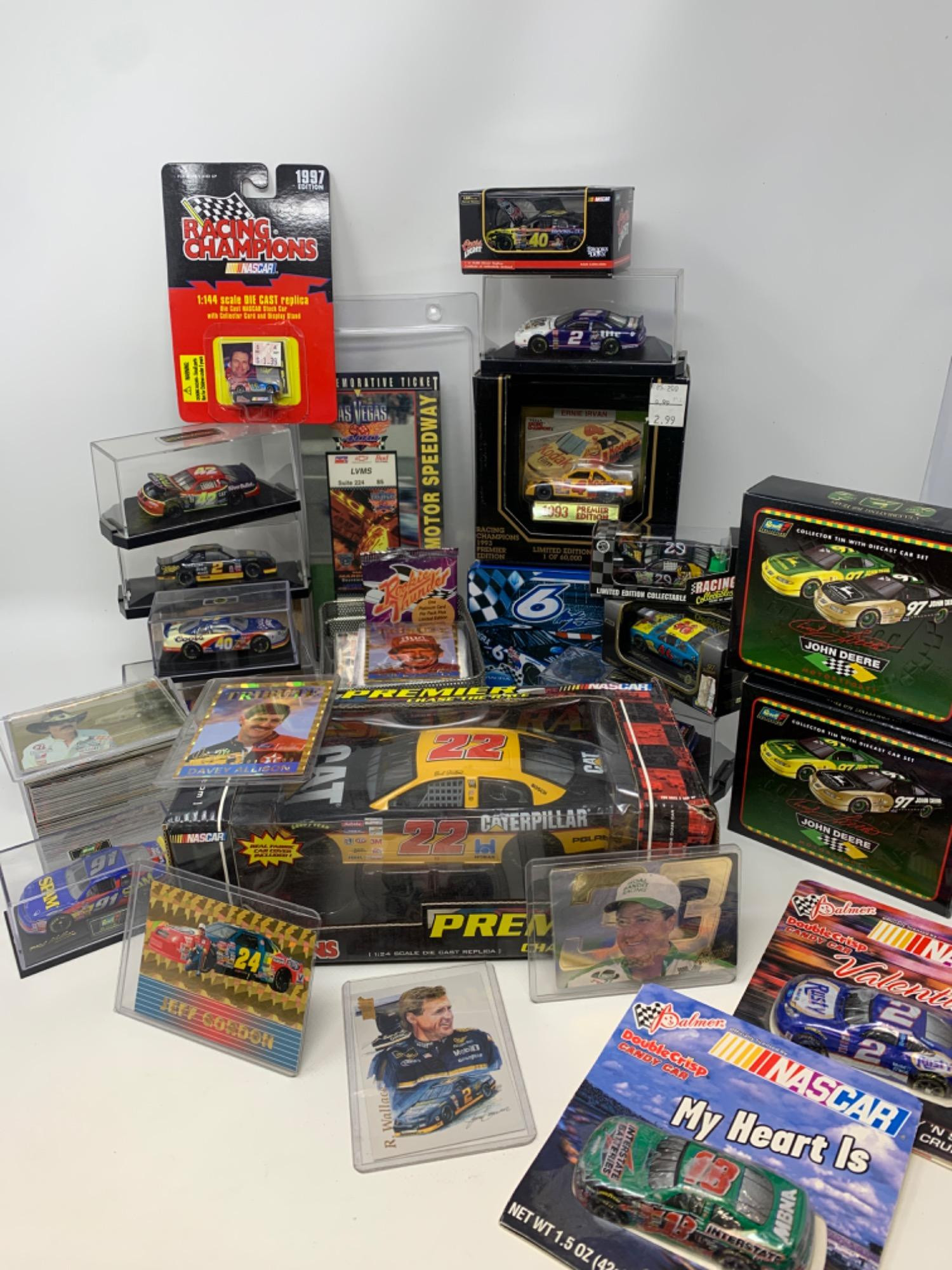 NASCAR memorabilia. Training cards, chocolate candy cars, 1/64 diecast cars in display cases. Larger chase car NIB. Sealed Las Vegas speedway ticket and more.