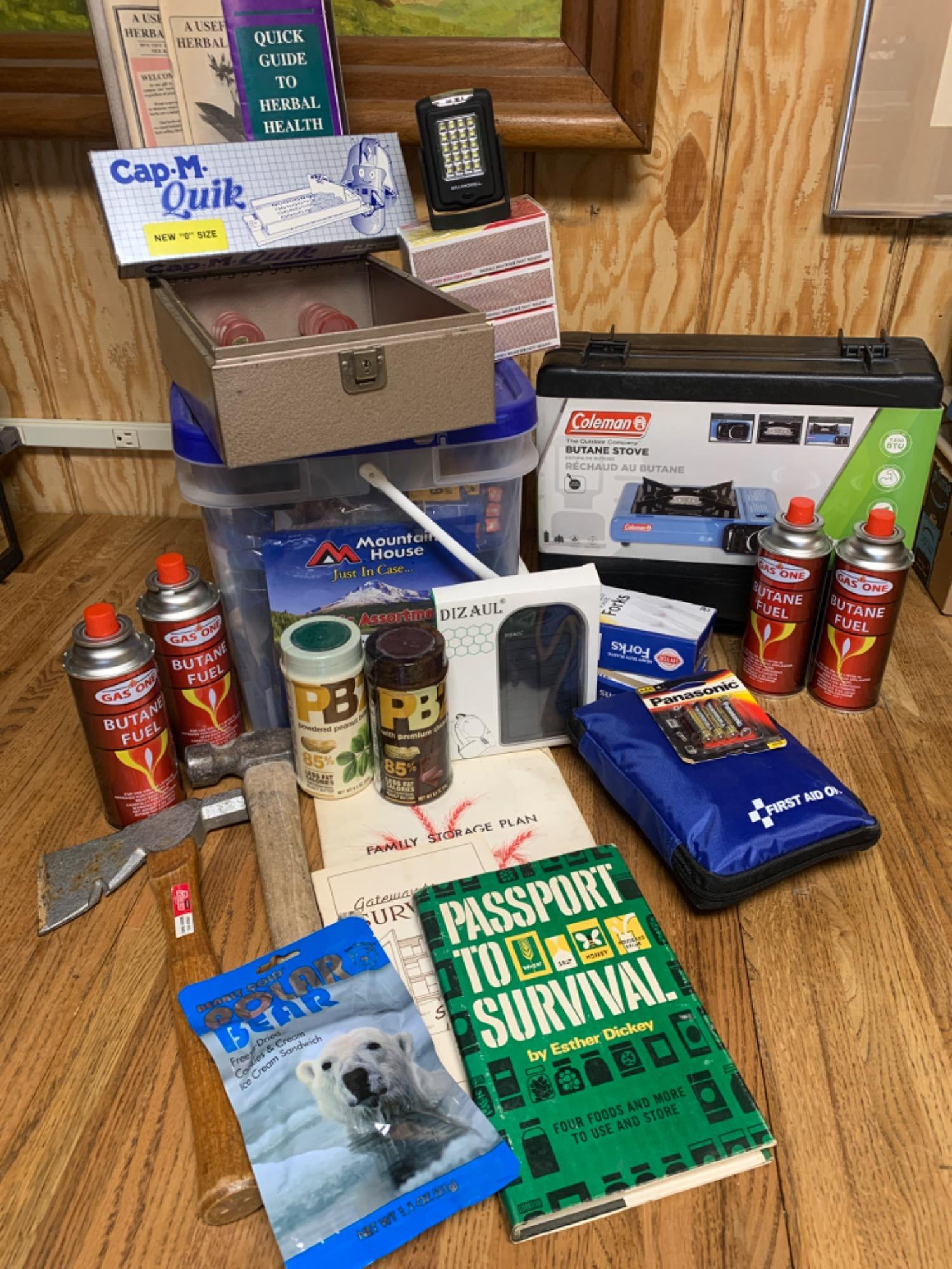 Survival kit includes first aid kit, batteries, solar pack, new butane stove, and fuel. Mountain house case of food, dehydrated. Small hatchet and heavy-duty hammer. Herbal health care guides, matches, flashlight, and more.