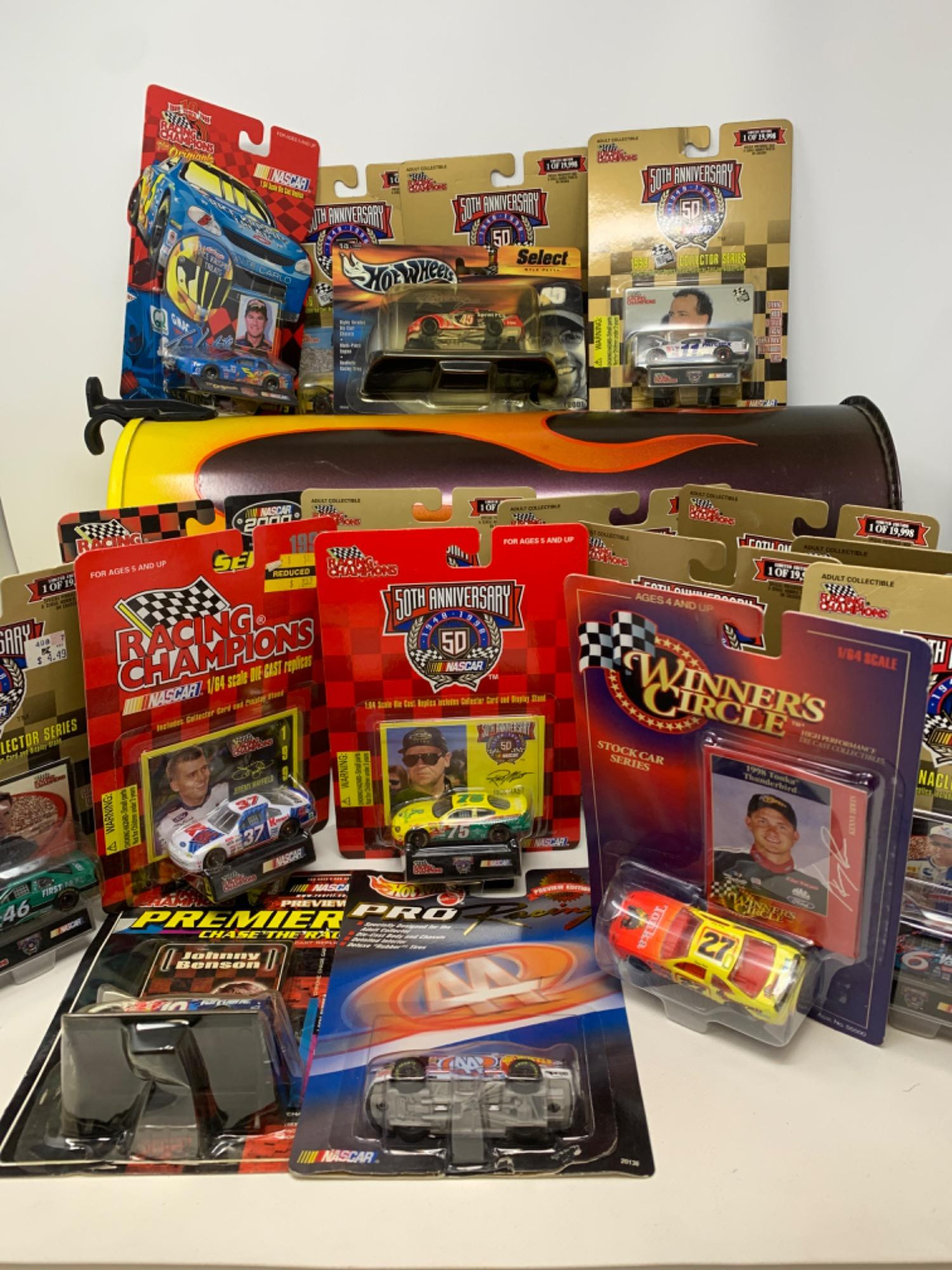 New mailbox with flames paint detail. Variety of NASCAR die cast cars. Winner circle, racing champions, hot wheels. All are new inbox. 50th anniversary edition for several. Some with trading cards. Several are redline.