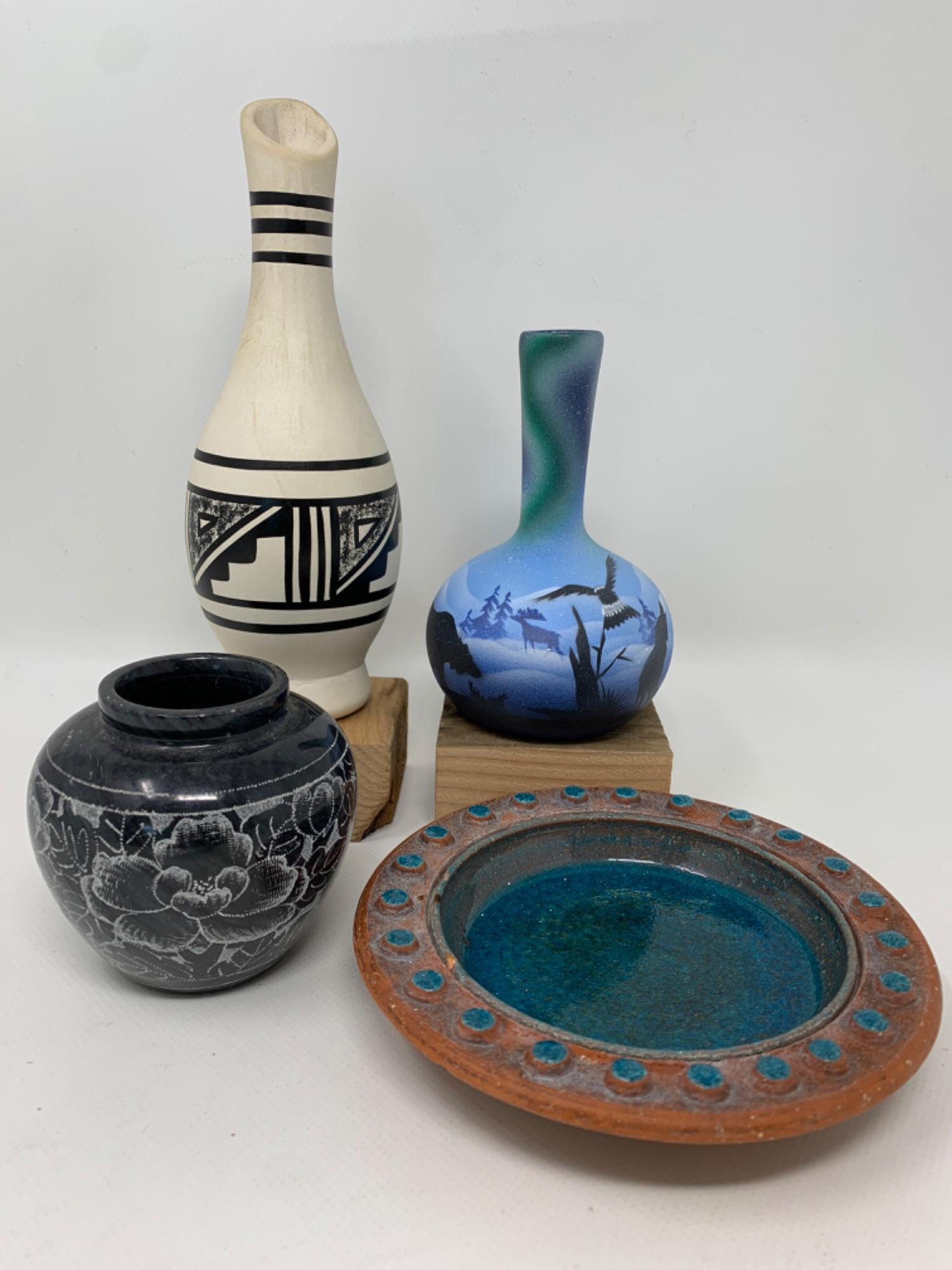 Tallest vessel is 8.5. It’s just tall. Plate is 6 inches wide. Etched black jar is 3.5 inches tall. Painted blue vase is 6 inches tall, 3.5 inches wide. Black stone with engraved flowers.