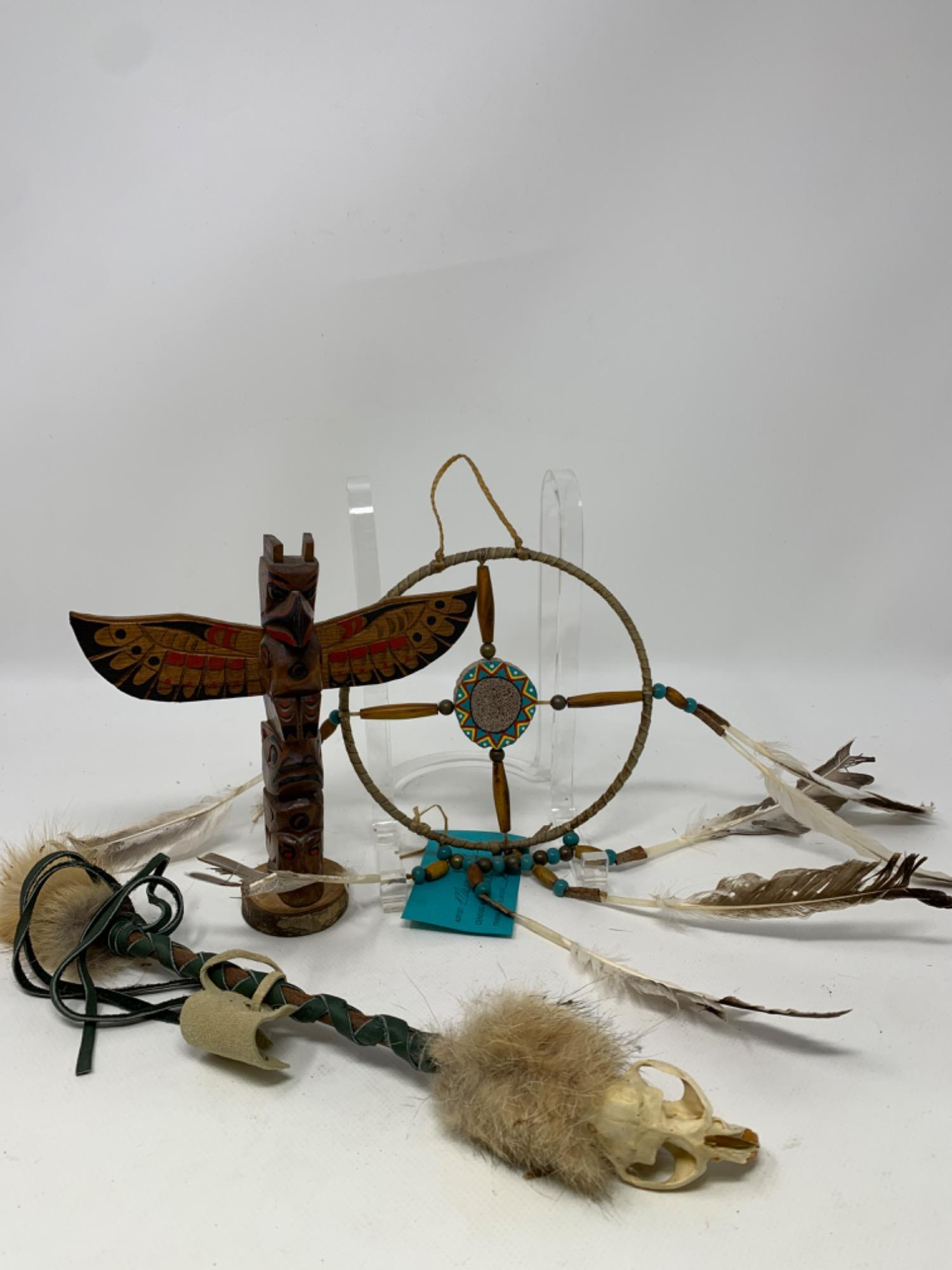 Quality indigenous crafts. Medicine wheel with bone eye. Hand carved and painted totem pole. Talking stick with small raptor skull.
