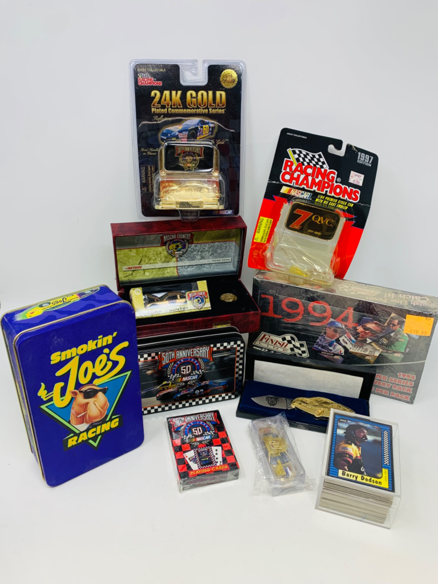 NIB special NASCAR collection. Trading cards, die cast cars, tins, pocket knife. Two packages are missing the car but includes collector tag. More was/may be added.