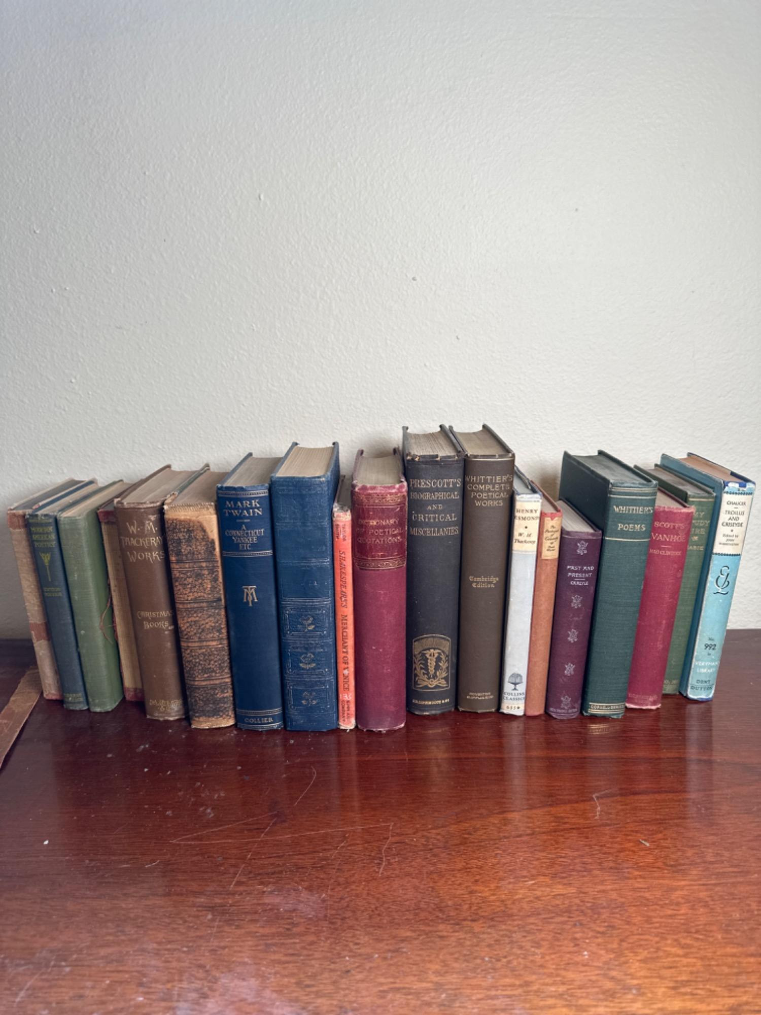 This lot includes Henry Esmond, Merchant Of Venice by Shakespeare, modern American poetry, Mark Twain, WM Thackeray, Past and Present the Pentecost Of Calamity, John Greenleaf, Whittier, Prescott, biographical. See Pictures for all books.
