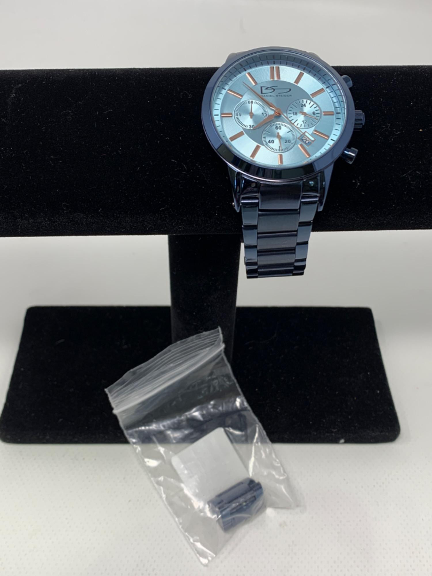 Daniel Steiger Blue Glacier men’s watch. Includes extra band links. Blue watch with Blueface. Copper toned dials. Three gauges and date setting.