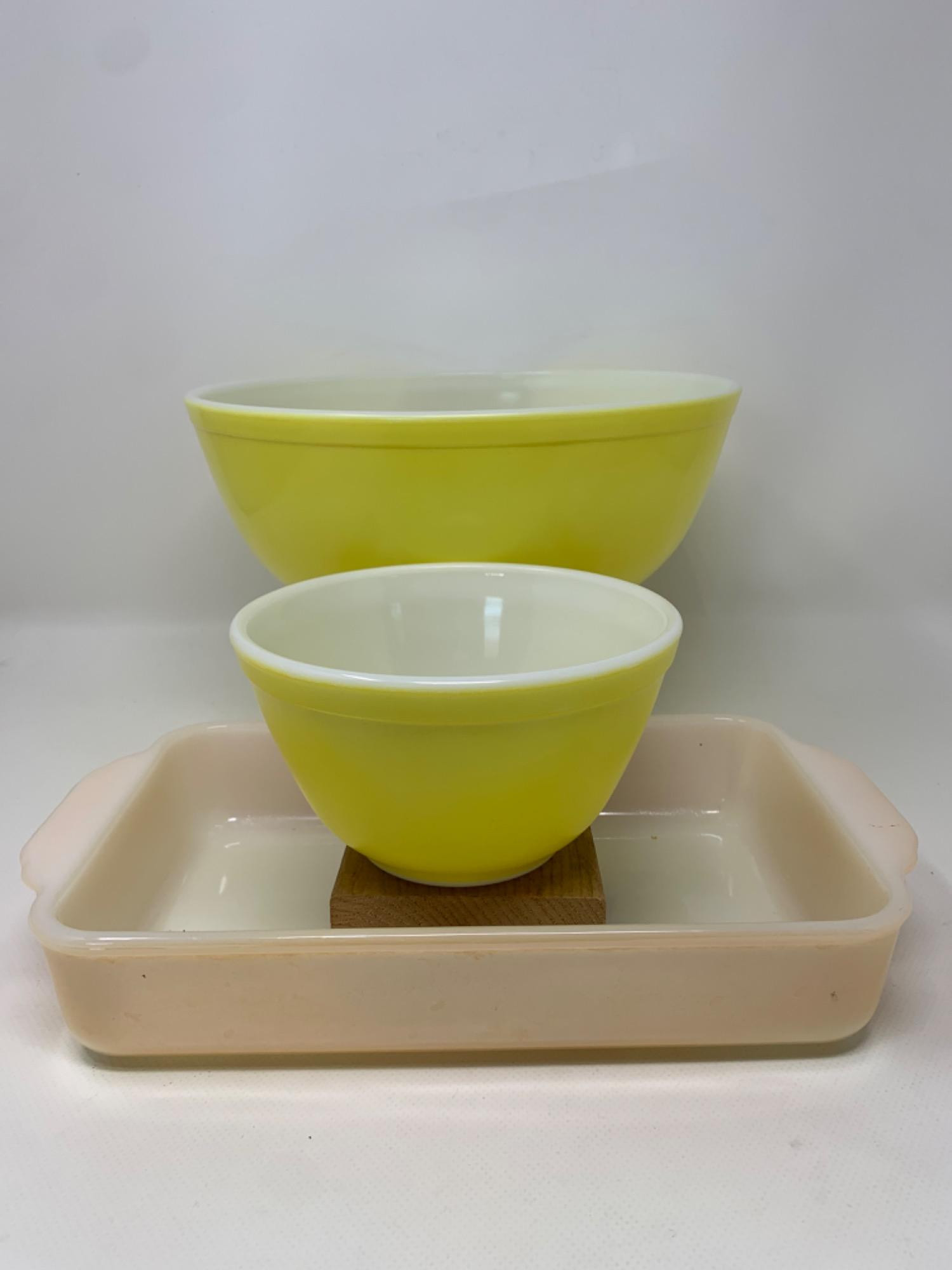 Vintage Pyrex lemon yellow bowls. Largest is 10 inches wide. Fire King peach luster baking dish is 12 inches long, 6.5 inches wide. Matching smaller Pyrex bowl. In great condition, with very little wear.