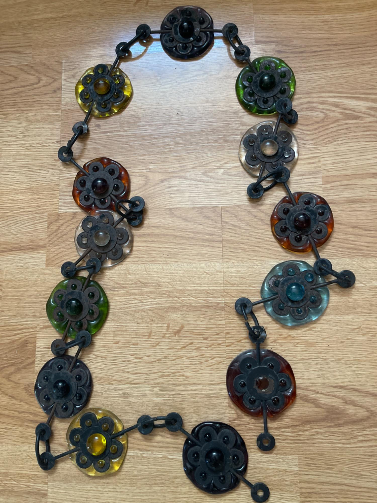 1960s DerFlinger Art Glass Sun Catcher- 5.5 Feet Long. Made of amber glass sculpted and protruding through iron circles creating daisy-like round flowers. 13 Flowers total. Brutalist feel.