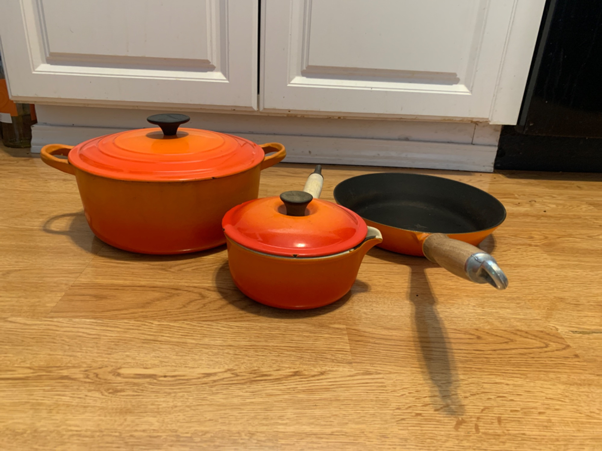Le Crueset Orange Cast Iron-Skillet, Dutch Over and Lidded Sauce Pan.