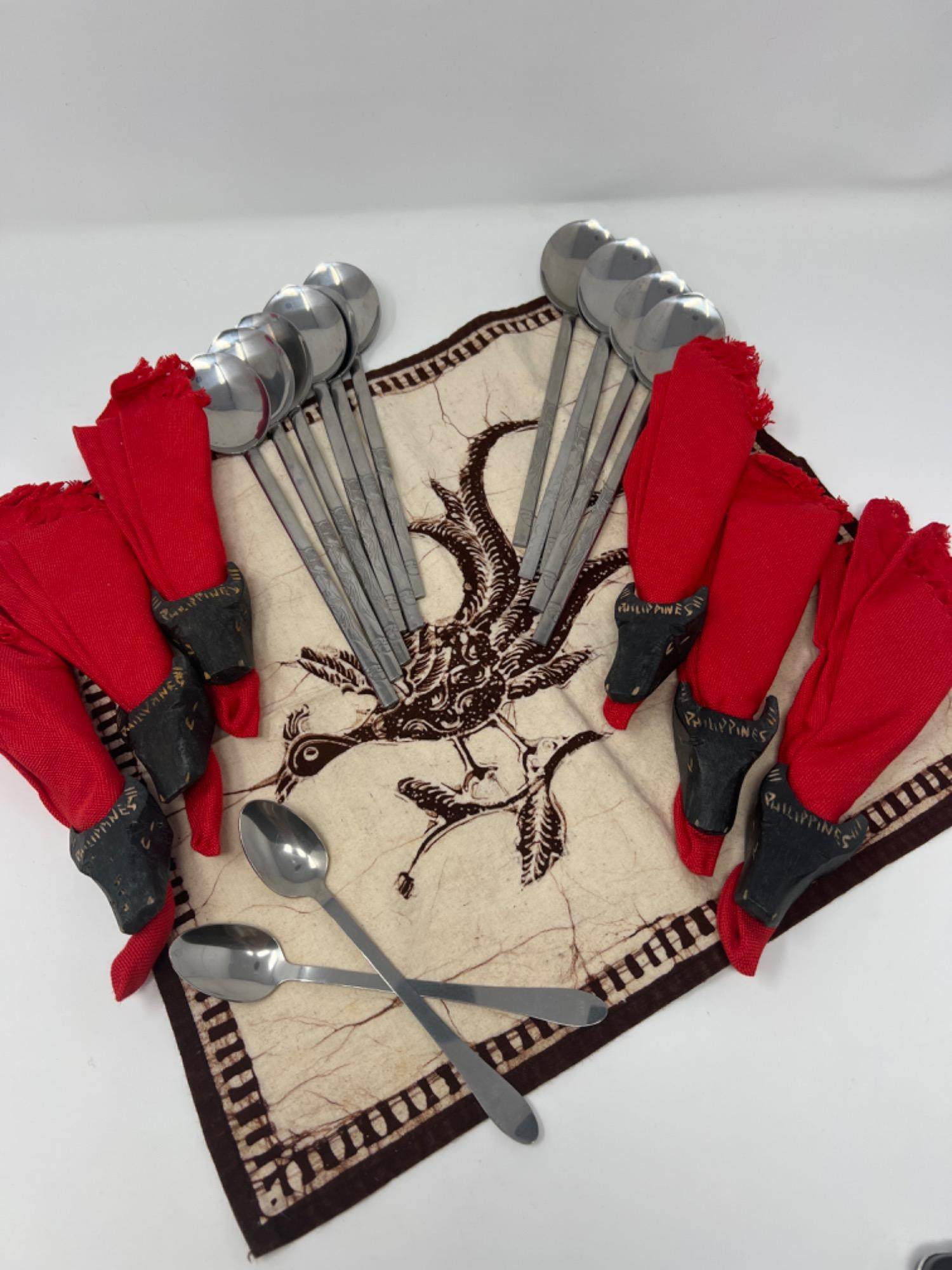Batik cloth with bird is 14" x 12". 6 vintage red cloth napkins with carved wood bull head rings made in the Phillipines. 12 soup/rice long handled stainless spoons (pictured 11 - we found one more). 2 smaller stainless spoons. All items are vintage.