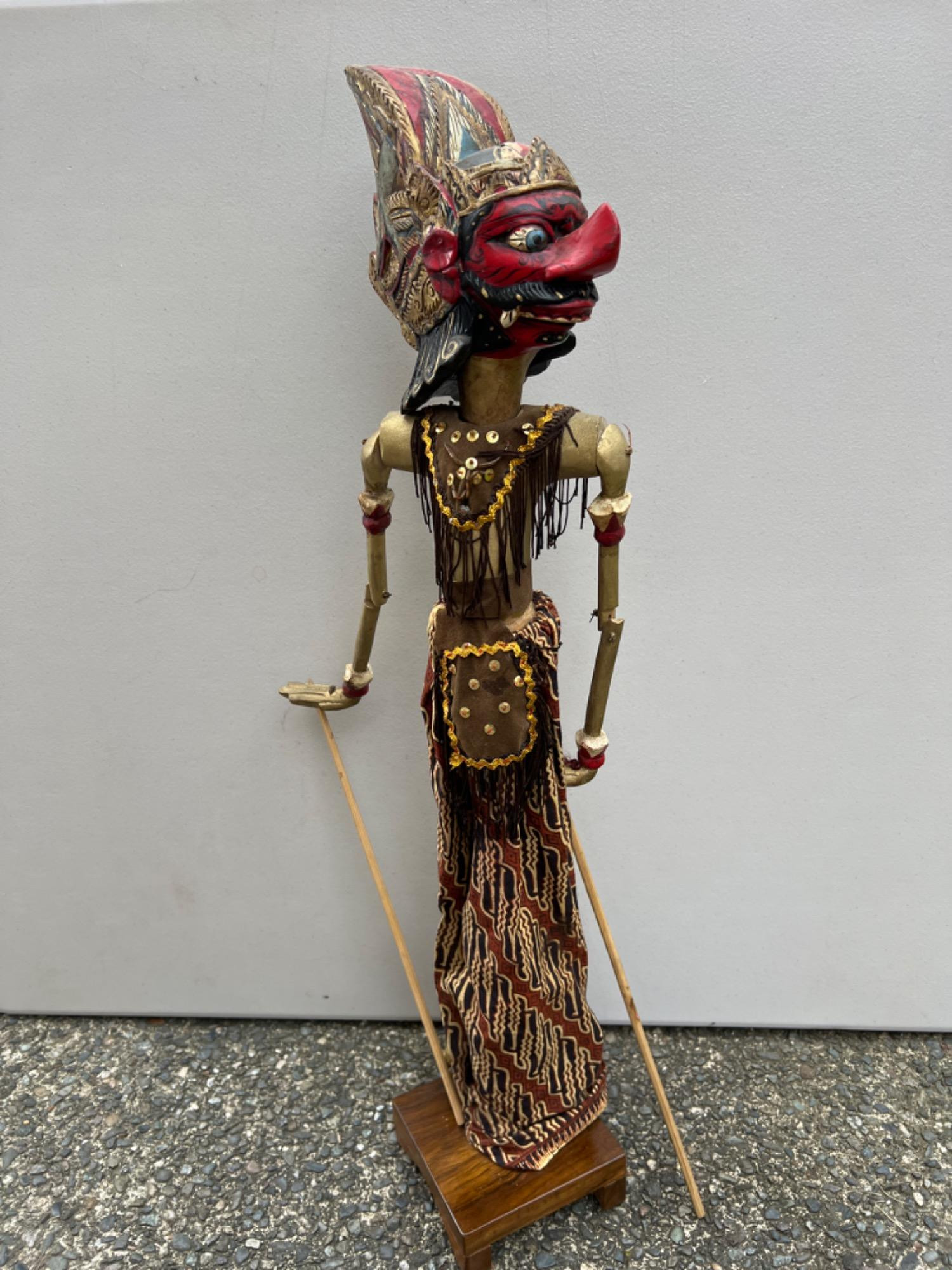 Indonesian Wayang Golek Hand Carved & Painted Wooden Rod Puppet #11. This is a hand carved wood puppet with bamboo rods that is creatively hand painted in Indonesian cultural style. Probably early 20th Century (antique), Java, Indonesia. This puppet is one of 14 varied characters in this auction. This one appears to represent a villain or court "jester" or "clown". The puppet has a wooden stand for display and also completely breaks down for transport and/or storage (see Lot 3 for example). Clothing is batik fabric and chest plate is made of velveteen fabric and decorated with sequins, beads, and flowing fringe. Arms are jointed. This is not a small puppet. It stands at over 2 feet tall. Puppeteer would hold stick under long fabric skirt to move head from side-to-side and use bamboo rods to move arms. As is condition. May have imperfections due to age or how the puppet was crafted.