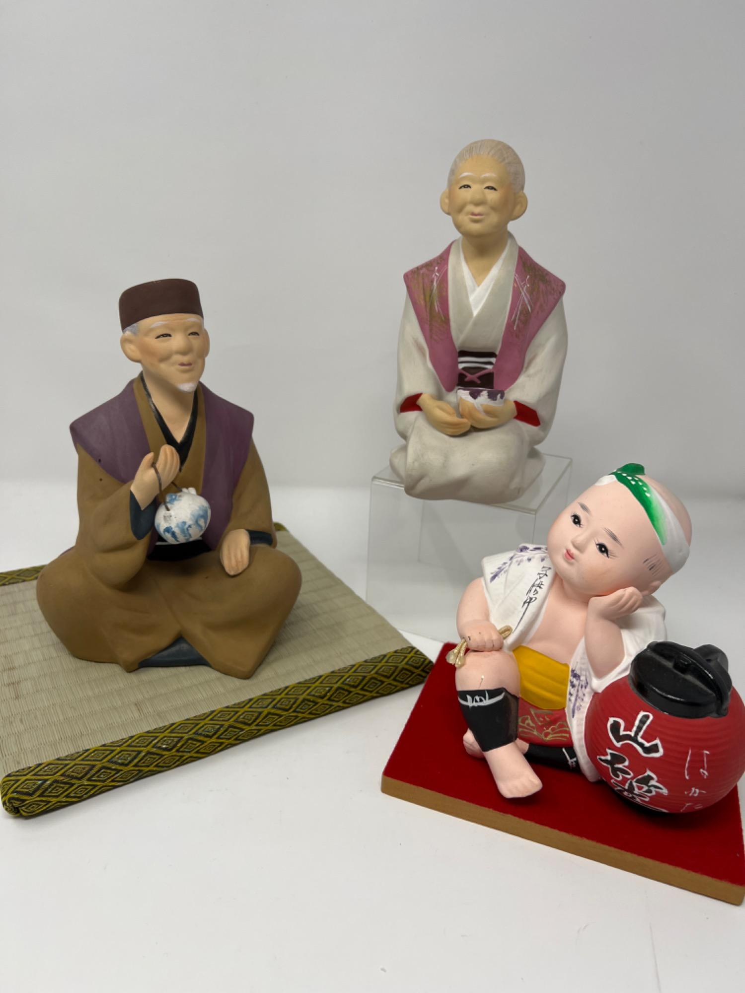 Ceramic dolls called Hakata Urasaki from Japan. Man with Teapot 8” tall x 6” wide x 4” depth Man with Rice Bowl - 8” tall x 4” wide x 4.5” depth Boy with Lantern - 6” tall cx 6” wide x 3.5” depth
