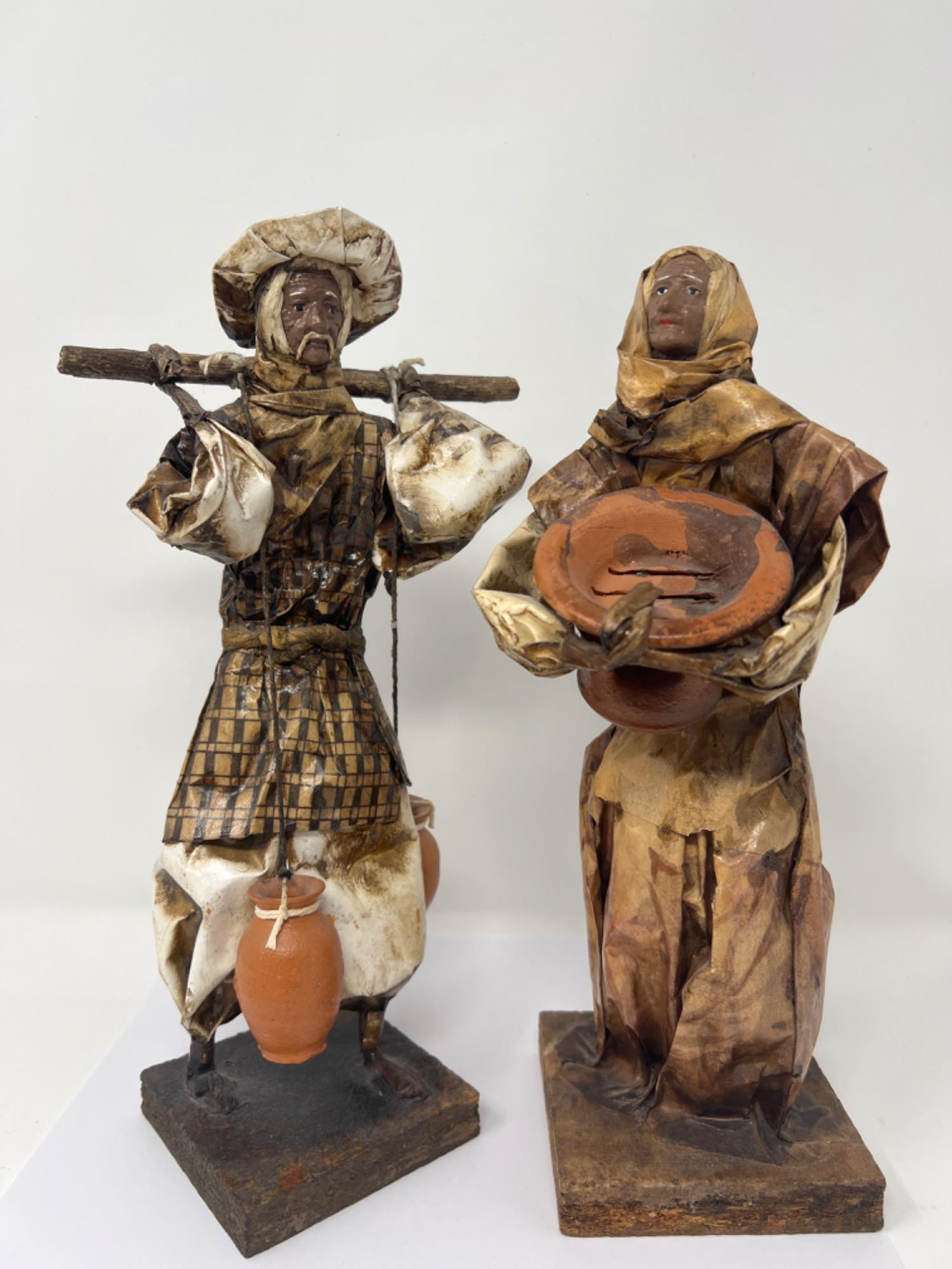 Figures are paper mache art sculptures potentially made in Mexico. Man carrying terracotta pots and woman carrying basin.