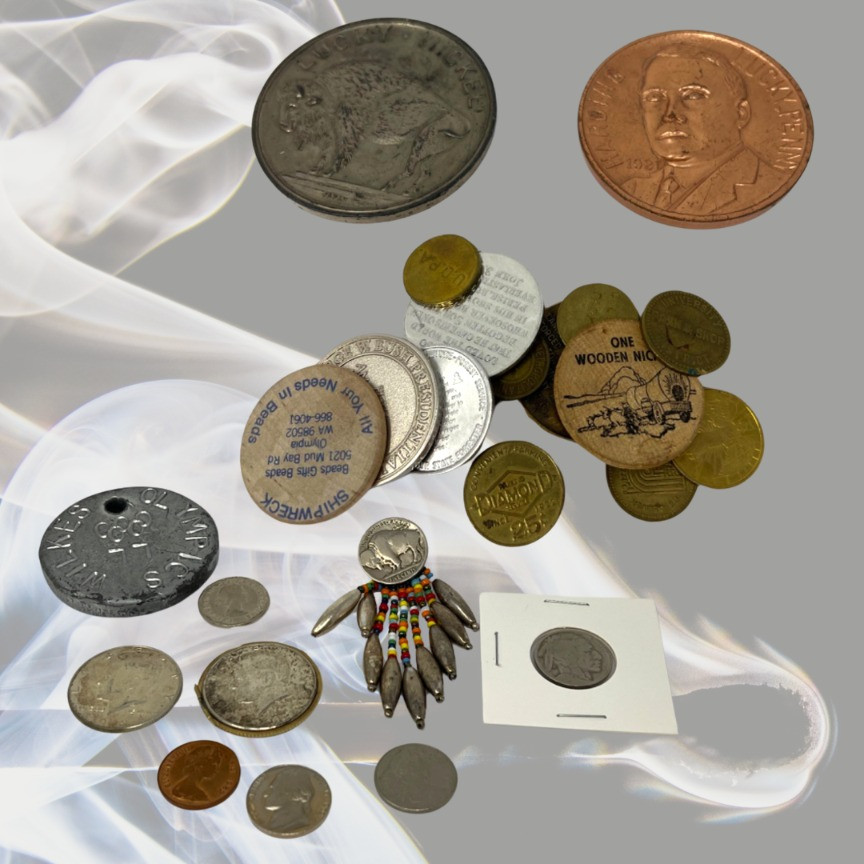 Various coins and tokens. Kennedy 1964 half dollar set in brass perfume case top, 1964 Kennedy half dollar (loose), Buffalo/Indian head brooch and U.S. nickel coin. Hopscotch token -Olympics, wooden nickels, parking tokens, and more.