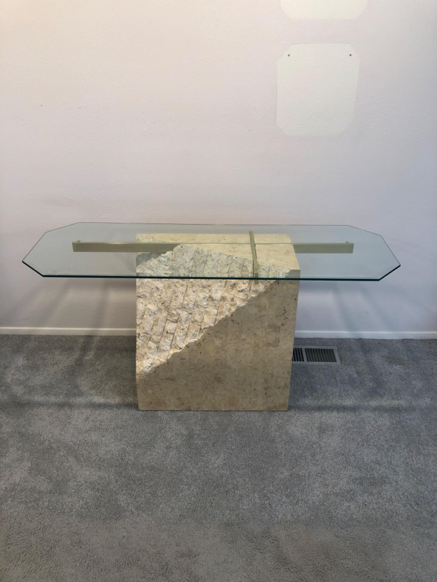 Made in the Philippines by JDI Group. Vintage (circa: 1980's) sofa or hallway/entry table with beveled octagonal glass top, brass cross supports, that sits on top of smooth and rough cut tessellated faux stone base. Value: $1,200-$1,900