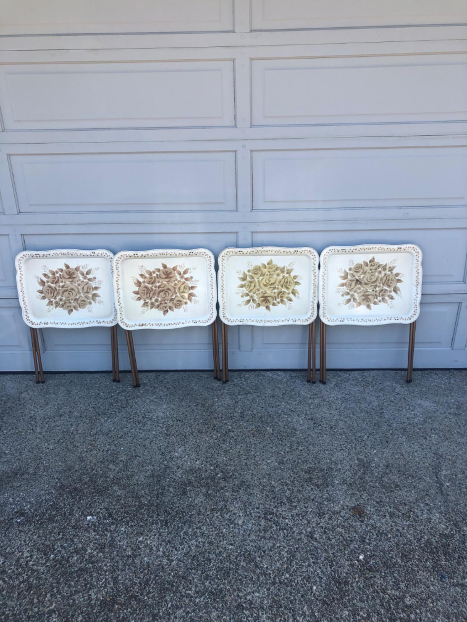 Four white metal TV trays with brass toned metal legs. One tray has a slight dent on side (see pictures).