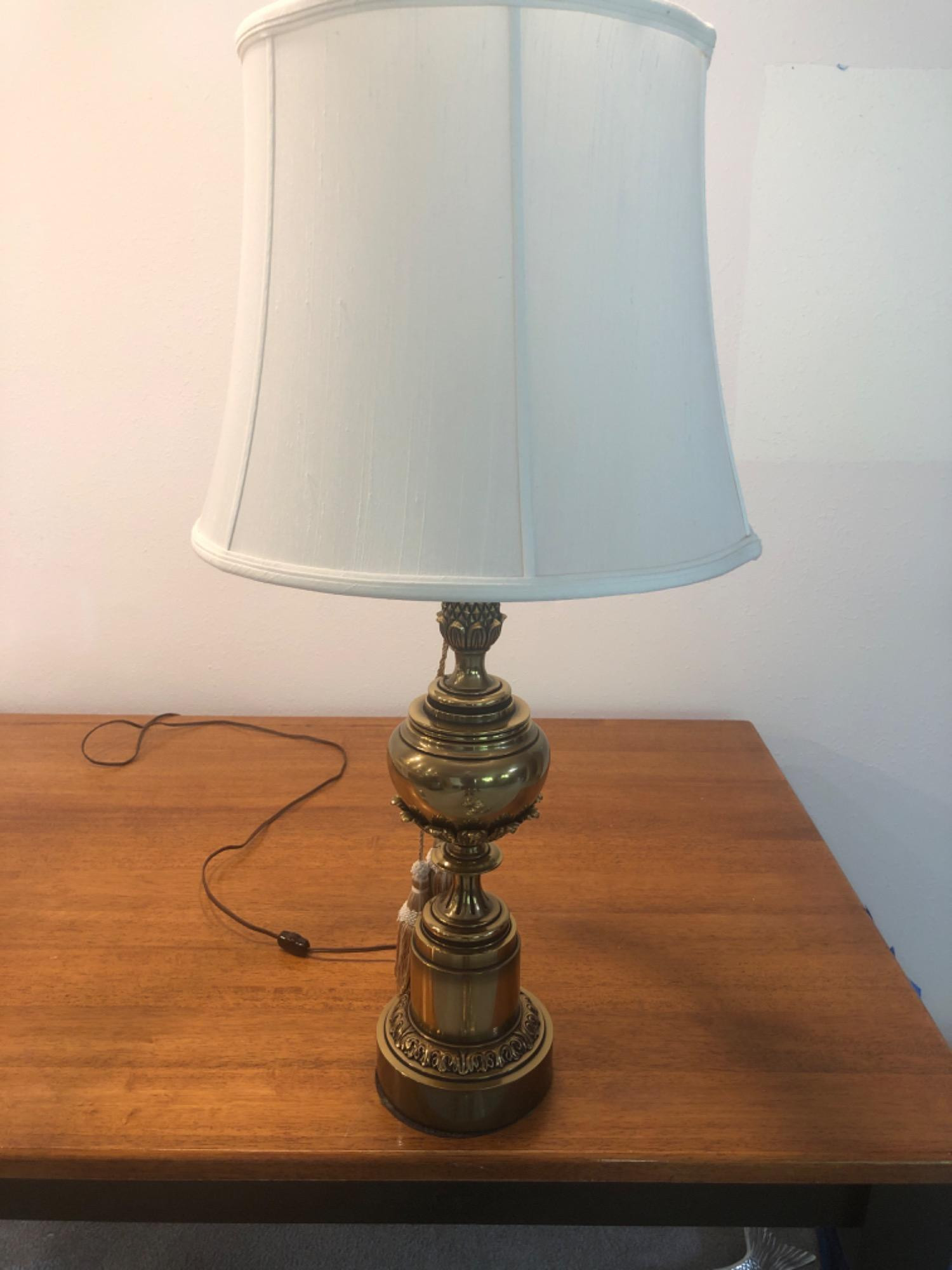 Brass lamp with on/off switch on cord. Bell linen lampshade. Cord and tassel is a decorative addon.