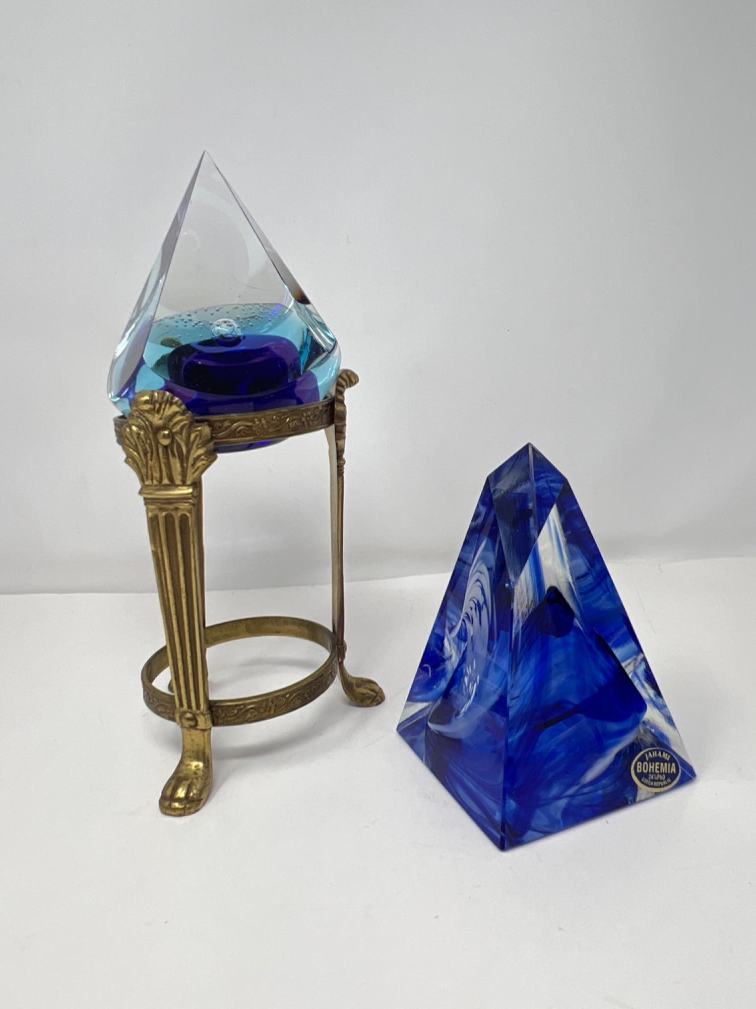 5” tall Pyramid underwater depicting pearl sitting on top of pillow and underwater bubbles. Sits on 6” tall brass stand. 6” tall Jahami Bohemia 24% PbO Czech Republic Oceanic Blue Glass Pyramid.