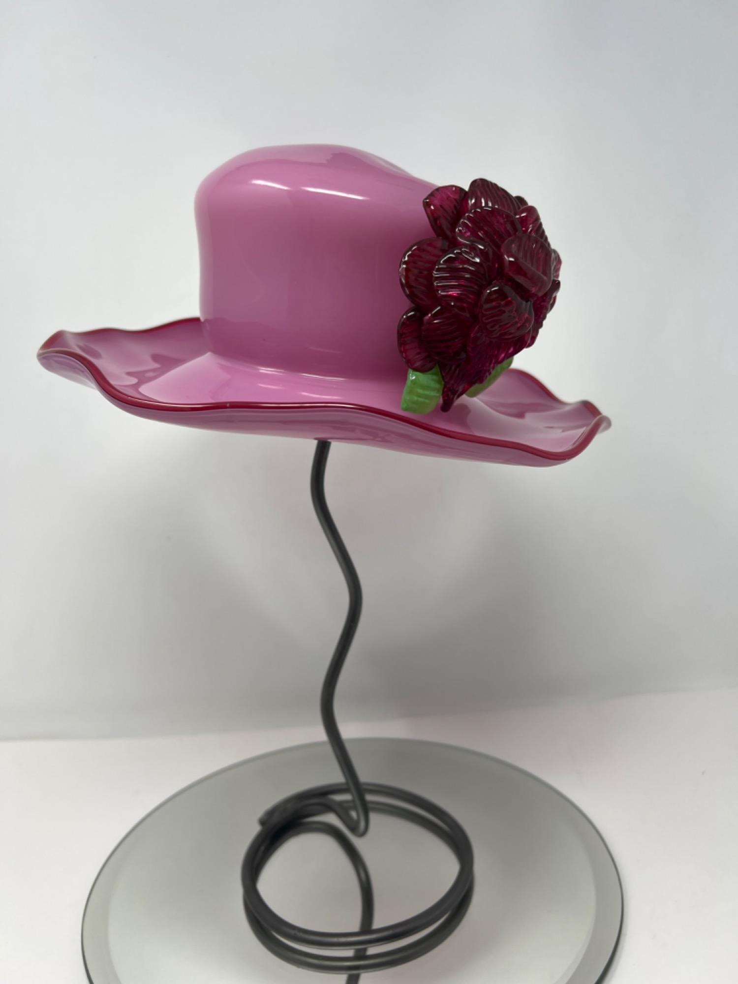 Signed by artist Brenna. Rosy pink with red trim and ruby red flower all fashioned from glass. Hat 11” diameter x 5” tall. Brenna custom stand 11” tall x 4.5” round at bottom. Included is a 10” diameter tabletop mirror.