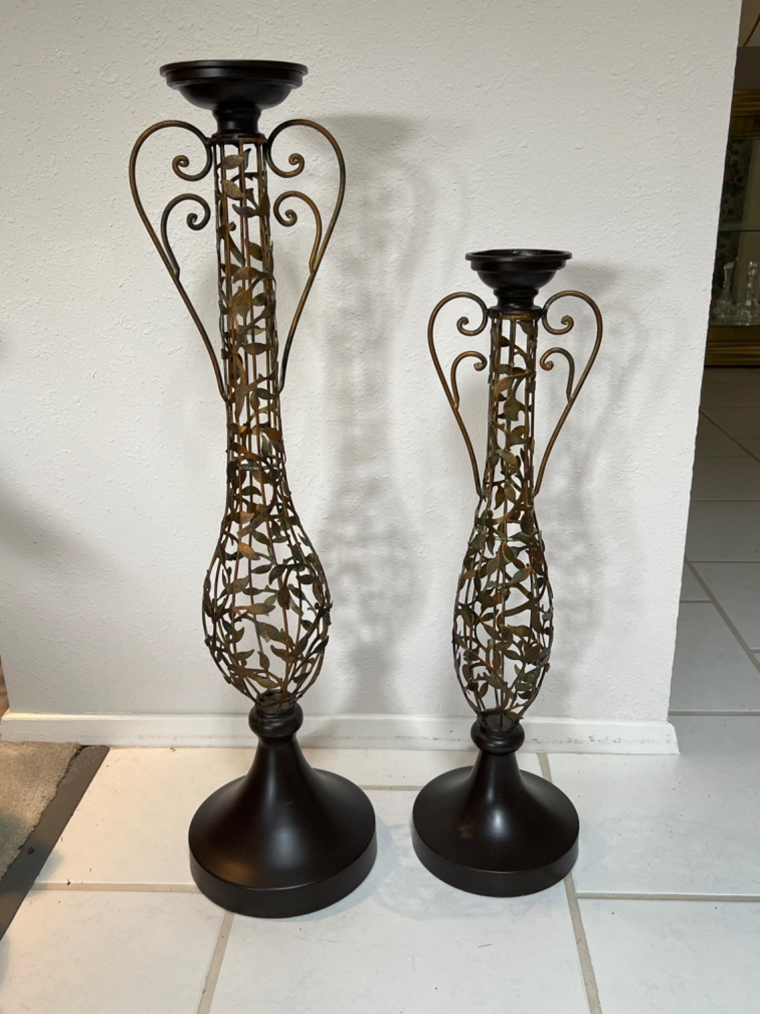 Cut metal leaves create the frame for these floor candle holders that have impressive height of 25" tall and 18" tall. Solid black metal base and black holders at top to set pillar candles.