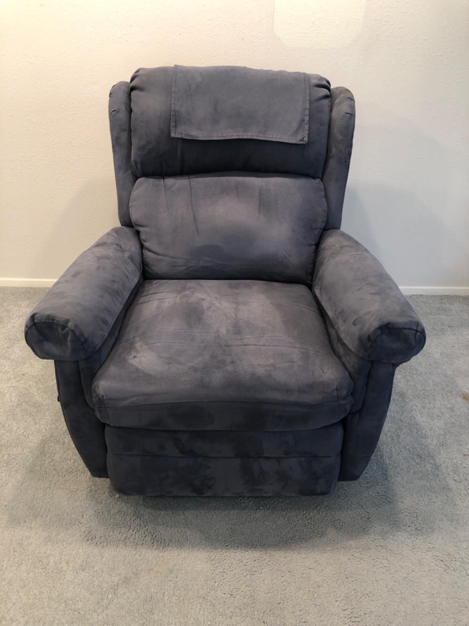 Lane Micro Fiber Recliner Color - Dusty Blue Dimensions: Ground to top of seat 18 inches - Ground to top of back 38 inches - Seat width 21 inches - Seat depth 19 inches Bidding on this lot is an agreement that: (1.) You