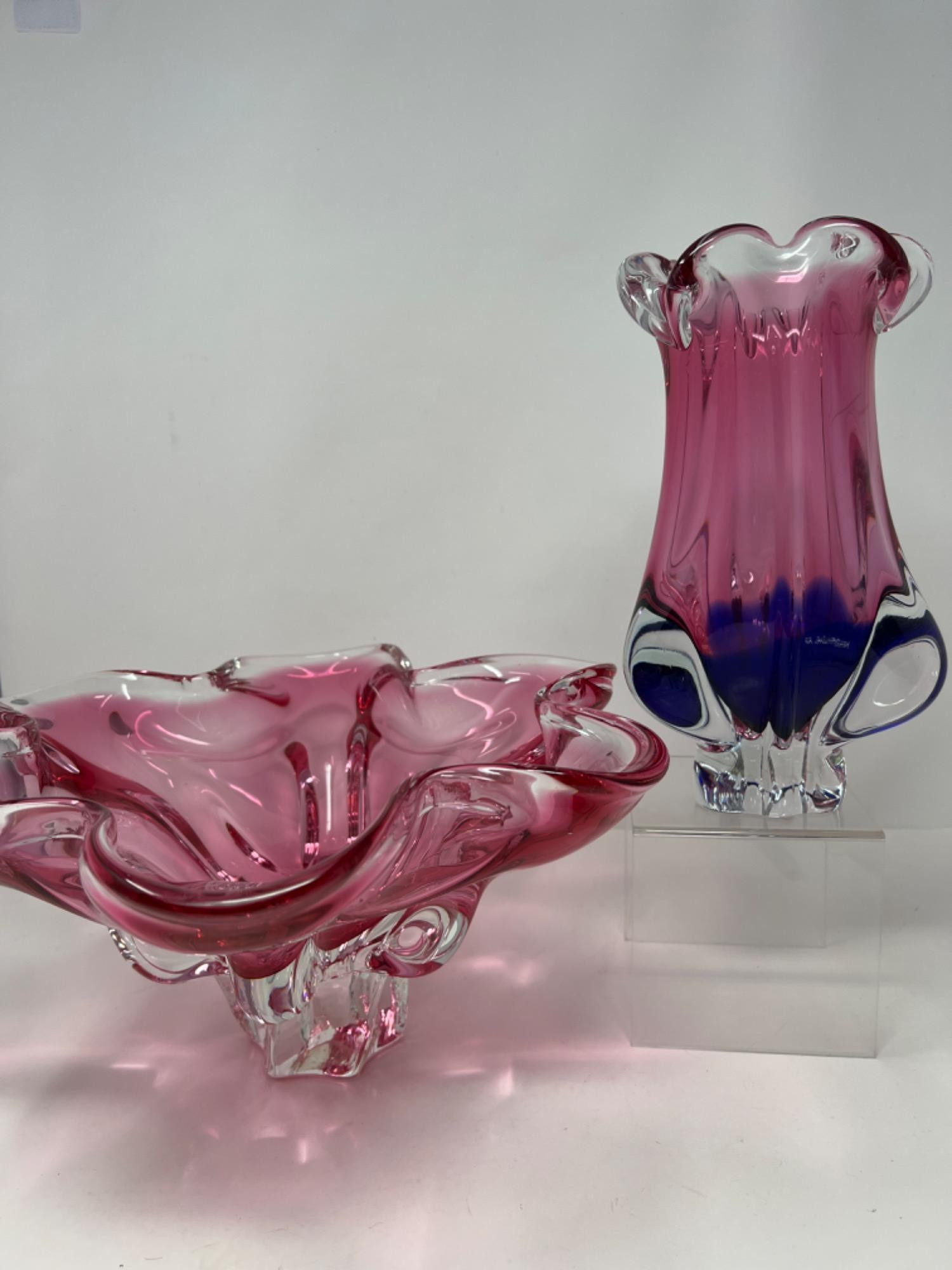 Fine art glass bowl that may be Josef Hospodka of Czechoslovakia (1960's) as the style is in keeping with this artist's glasswork. 13" round and 6" tall. Outstanding blue to pink glass work vase 12" tall also in keeping with Bohemian style glass works. Both art pieces are unmarked.