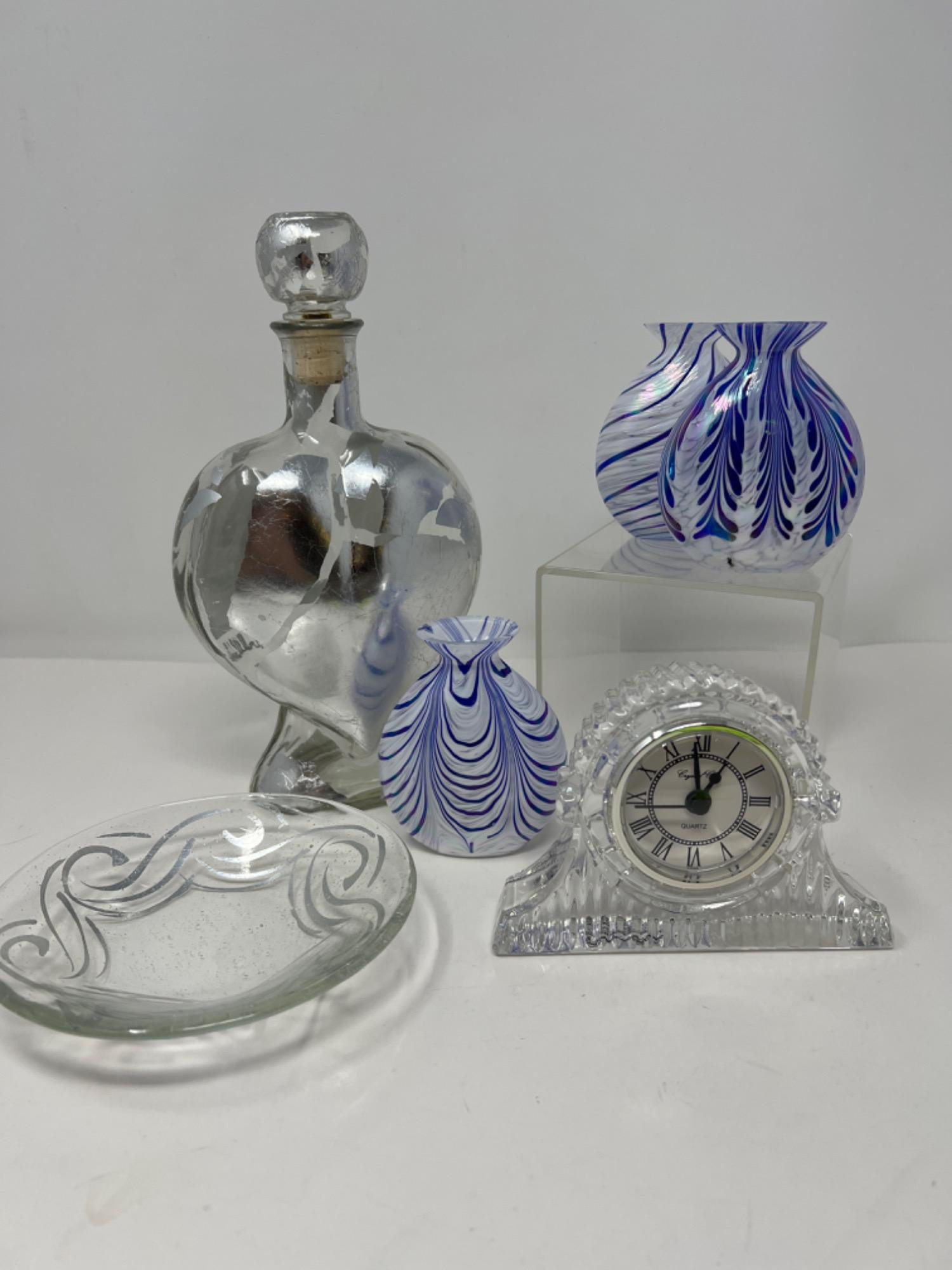 6" tall Perfume or decanter with silver overlay pieces on clear glass and signed by artist. Clear glass clock and other small decor.