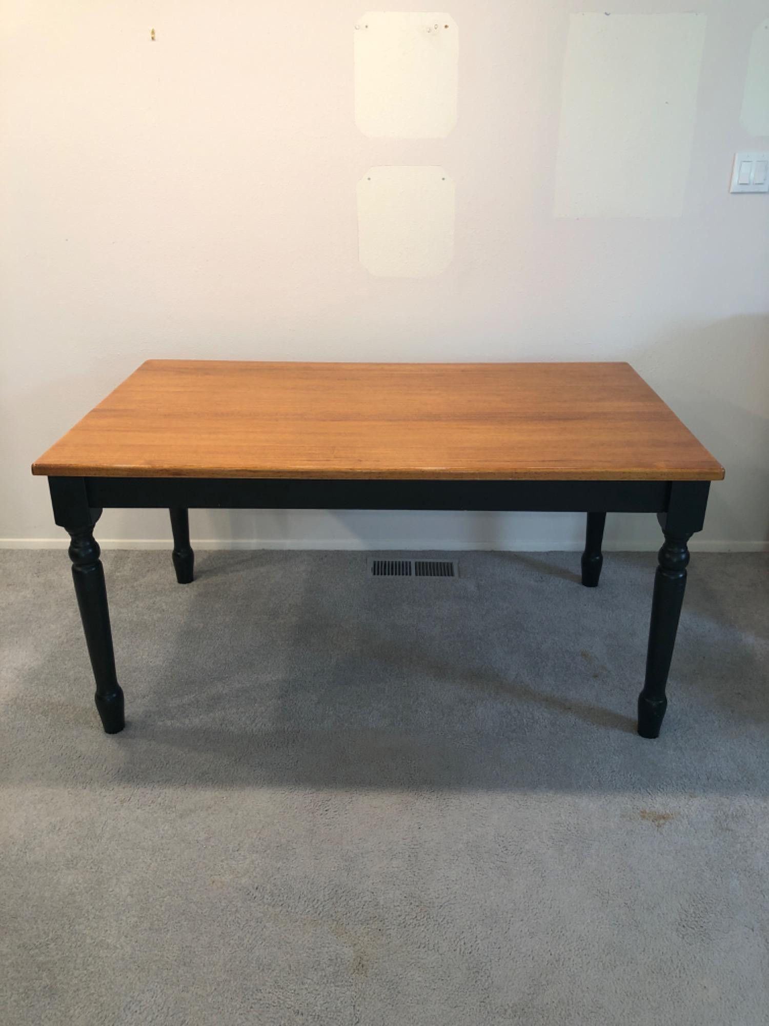 Large Wood (poly lumber?, oak?) Table with french country styling Stained oak top with dark green legs Legs easily remove (bring Philips screw driver)