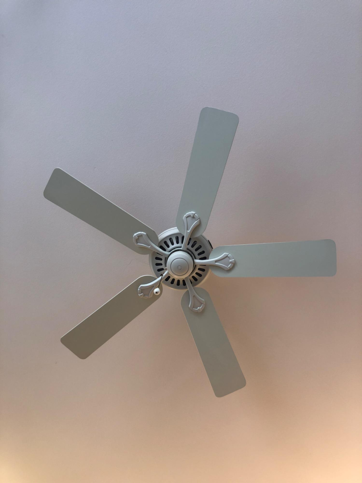 Hunter 5 Blade Ceiling Fan Dimensions: Hangs down 10 inches - Outside blade to outside blade 49 Inches Ceiling fan is installed in the ceiling and will have to be removed by the winning bidder If bidding on this item, you agree to bring the proper tools to remove the item from the ceiling