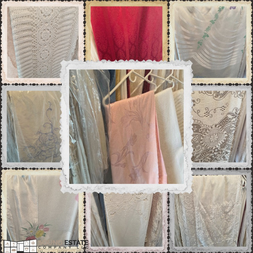 Beautifully kept table linens for fine dining all pressed and stored on hangers. There is a variety of colors and styles. A few lace cloths. The blue on white embroidered tablecloth has matching cloth napkins (also included). Lengths are assumed to be from 78" to 130". There are 34 total tablecloths.