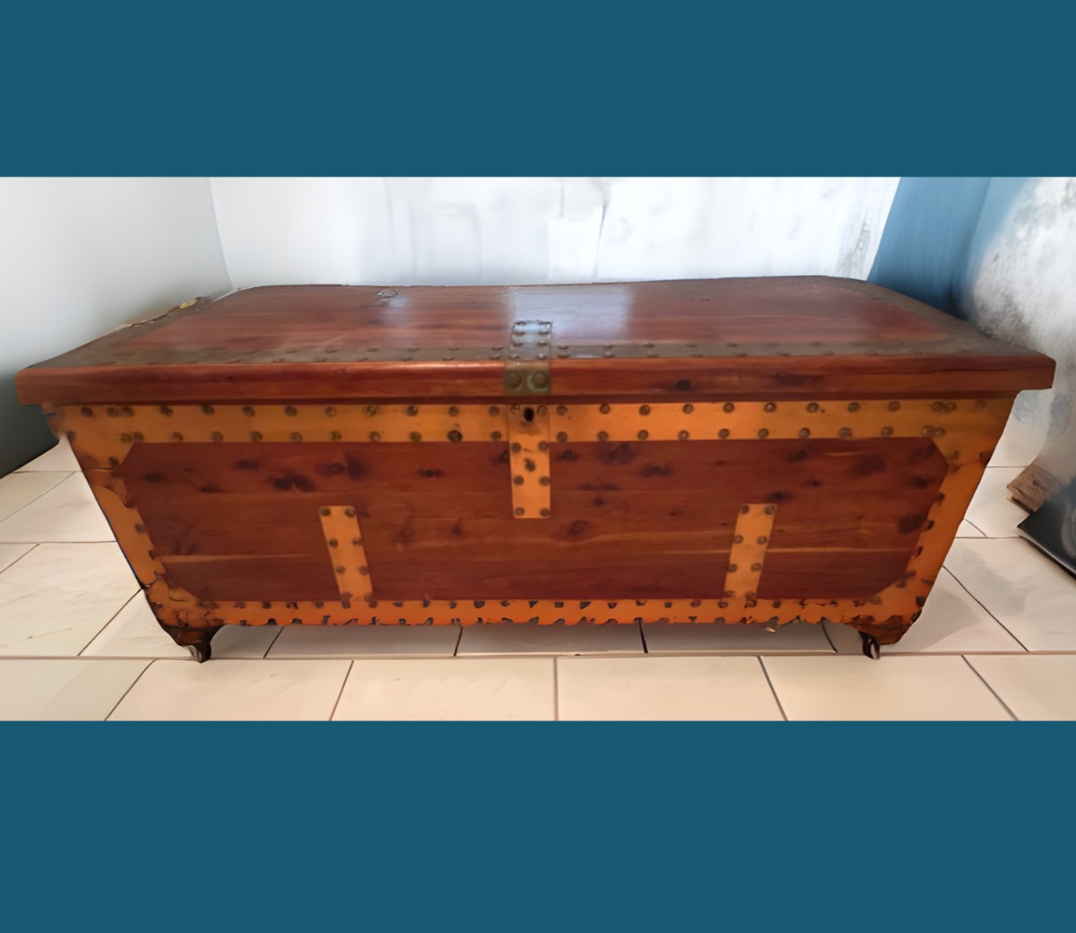 Heirloom early century handmade chest made of pine and secured with brass metal plates and brads. Locking with skeleton key.