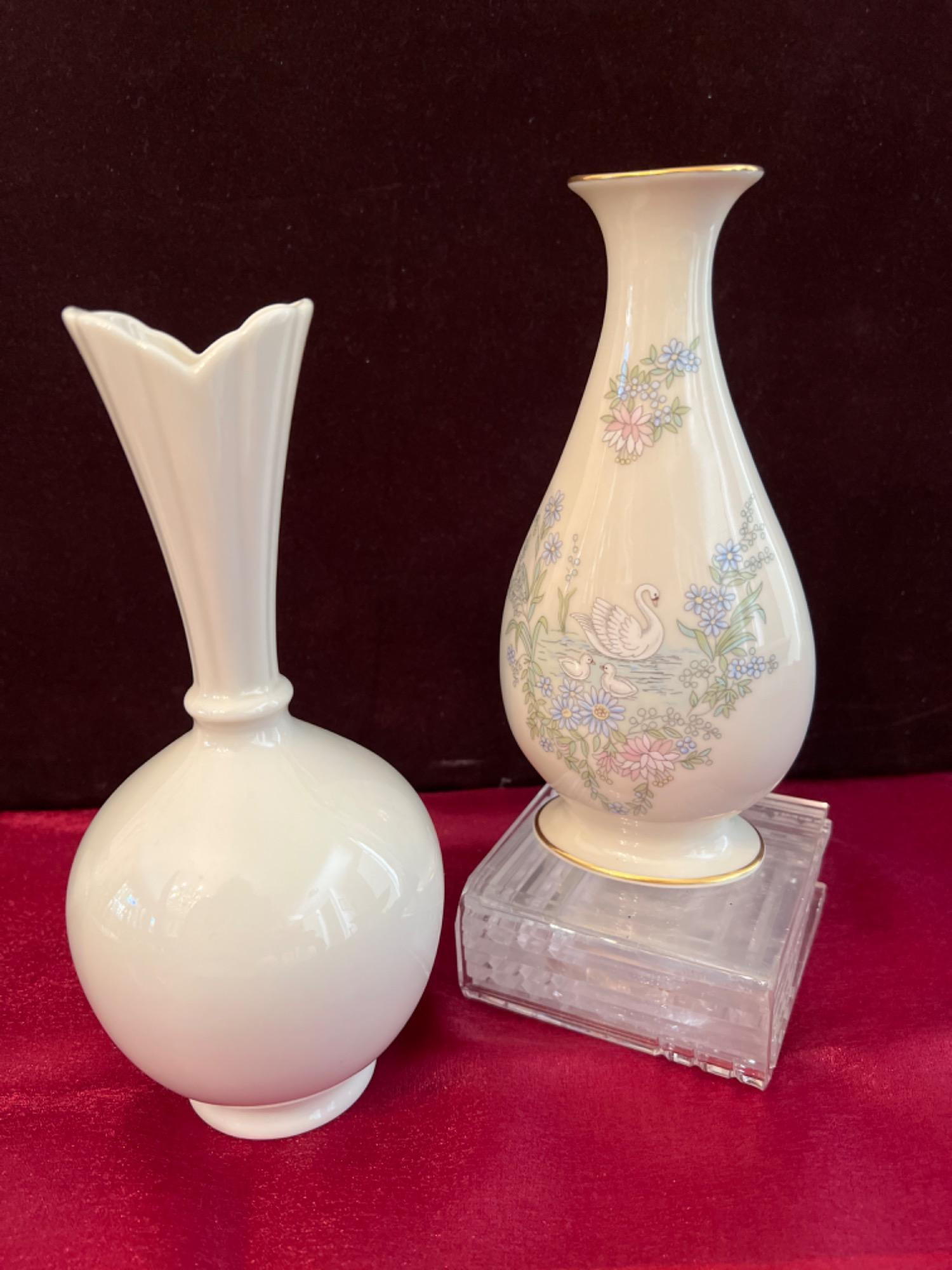 Mother’s Day 1983 Swan Limited Edition Lenox Vase, Made in USA, 7.5” tall x 4” wide, gold trimmed Rare Flute Neck Lenox Vase, 8” tall x 4” round, tulip style at top, made in USA.