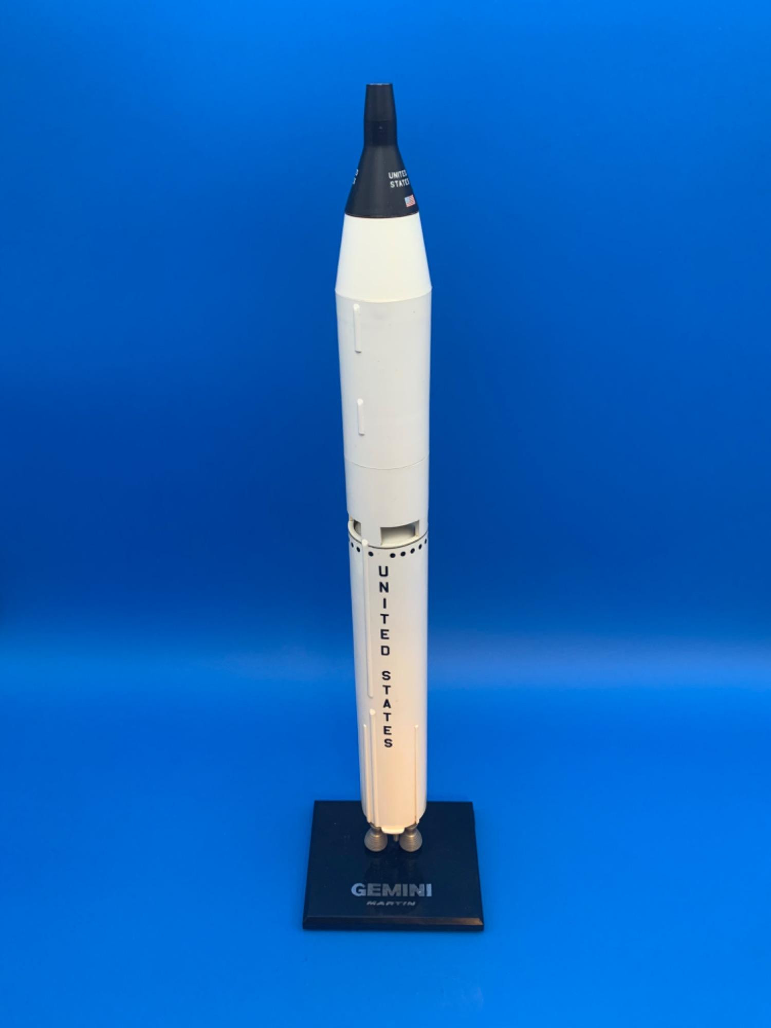 Desktop model of Martin's Gemini from Topping circa 1960s.. Black plastic square base* with 2-pin mount.. Rocket comes apart into 3 separate sections and is in good shape with sleek lines. Was displayed on a high shelf for many years - a good scrub would make it shine. * velvet pad on the bottom needs to be reglued into place