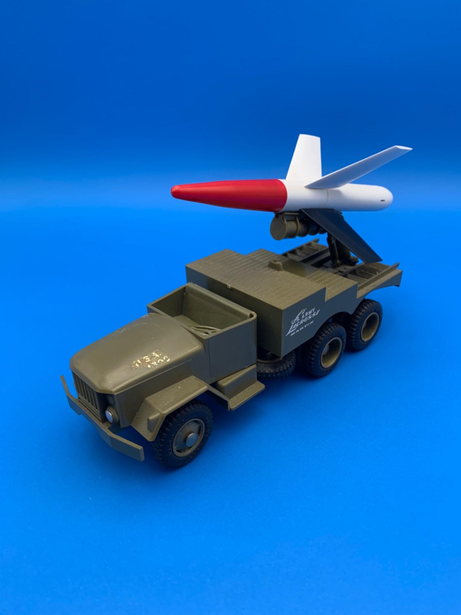 Vintage desktop model of Martin's truck-mounted Lacrosse missile by Topping. US Army insignia. 1960s.Green plastic US Army truck has black "heavy duty" double sets of wheels with an arm to lift the missile upright. Please note that while the model looks pretty good as is, we believe it is missing the truck cab above the seats, small fins at the missile rear, and shows wear on some of the decals. We are told this is a scarce item, thus we are offering it despite these flaws. Please look closely at the pictures. https://www.maronline.org.uk/topping-models-lacrosse-missile-and-launcher/