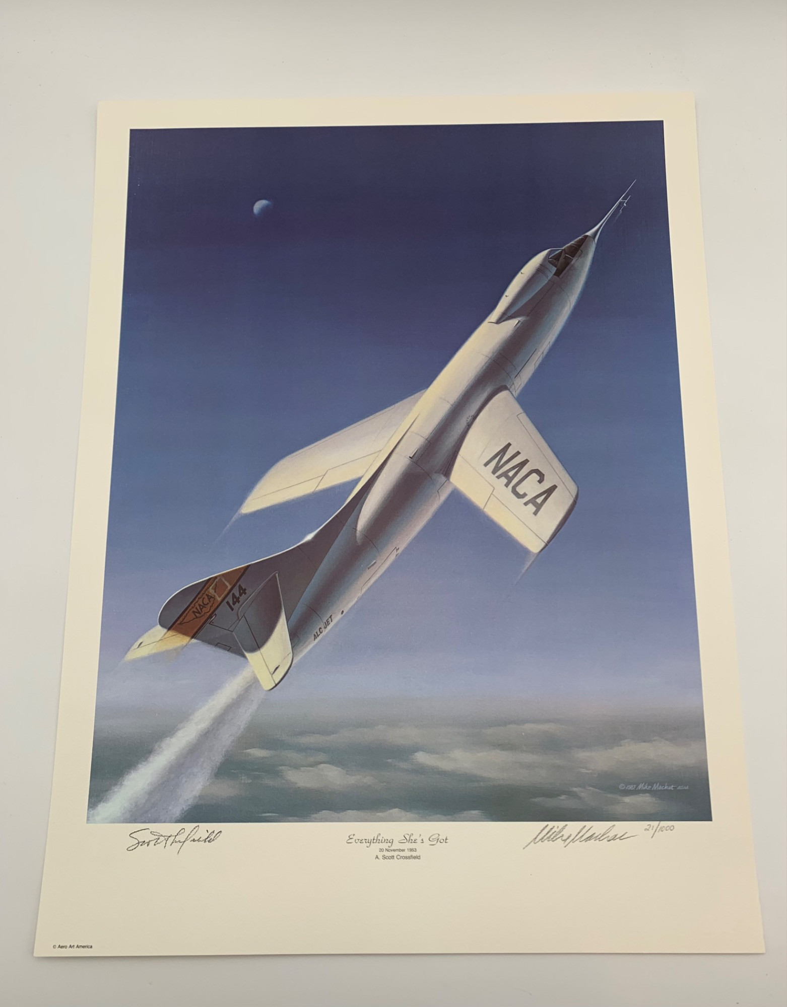 Beautifully executed limited edition print of A. Scott Crossfield's 1953 NACA 144 flight that first reached Mach 2 by artist Mike Machat (original painting done in 1987). This print is full-color with highly saturated hues. Printed on quality paper and inscribed at the bottom border. This is #21 in an edition of 1000 recorded in pencil on the lower right along with artist Mike Machat's signature. On the lower left is the signature of A. Scott Crossfield (1921 - 2006) in pencil. In the lower middle is the printed title “Everything She's Got". Comes with certificate of authenticity that gives great detail on the flight and the program. The artist, Mike Machat, is a former USAF pilot, author, and artist with work spanning numerous decades. His works are in many institutions including the Smithsonian Air & Space Museum. Print paper measures 20.75” H x 33.5" W. Printed area measures just over 16.5" H x shy 29.5” W. Unframed. Note - there is a VERY slight area on the upper left that appears to be a rub of some kind - we did not notice it until starting to do closeups - it doesn't affect the overall quality of the image in any way, but we wanted to mention it - see last photo.