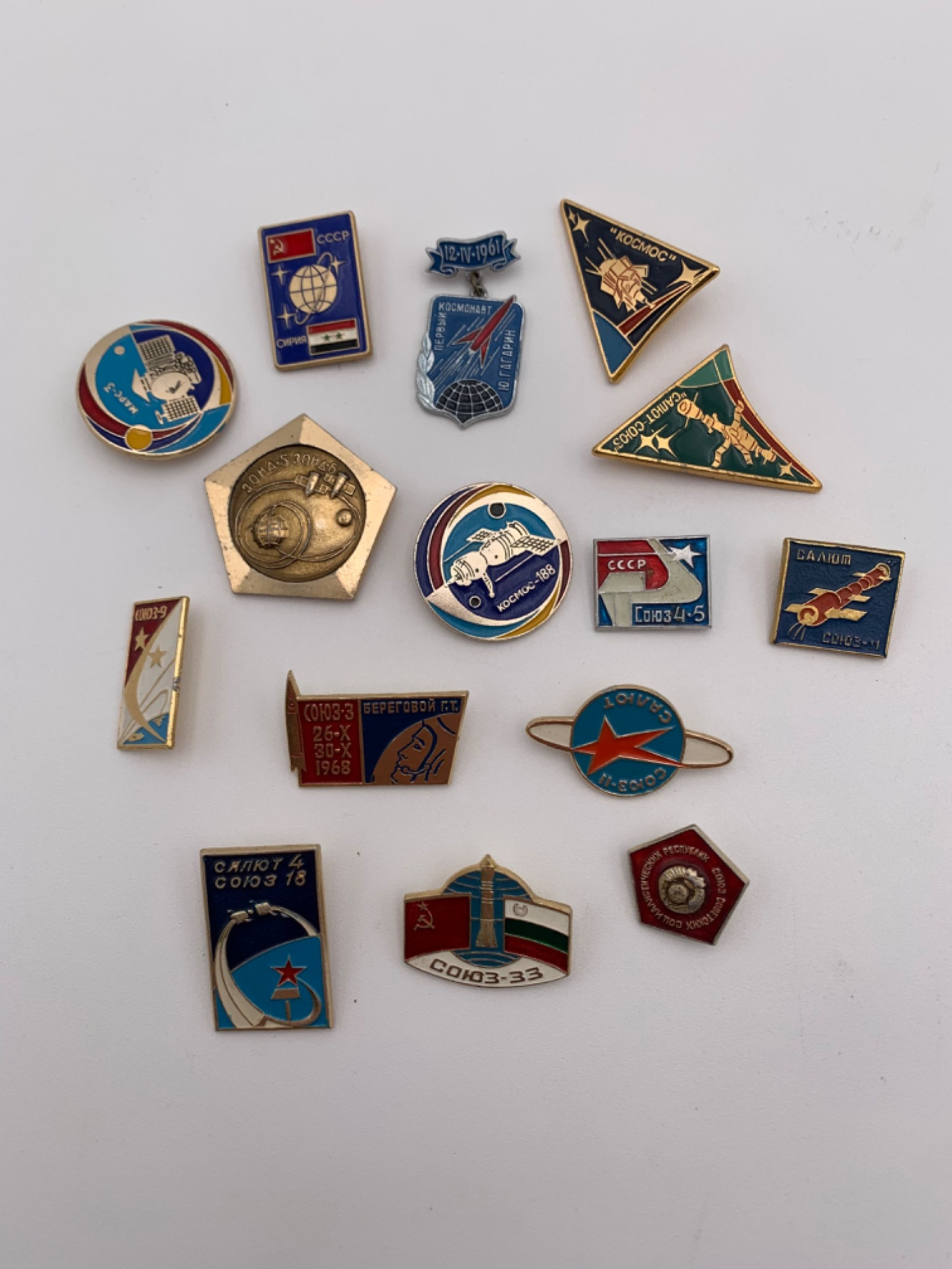 Group of 15 Soviet spacecraft/mission pins. Our Cyrillic knowledge is