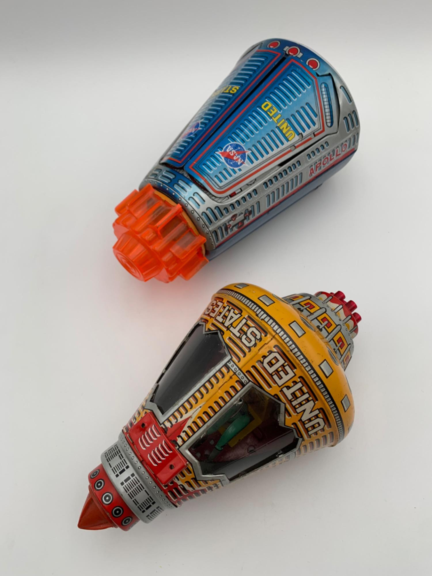 (1960s) tin litho space capsules from SH-Horikawa of Japan: Apollo in blue and Friendship 7 in yellow.